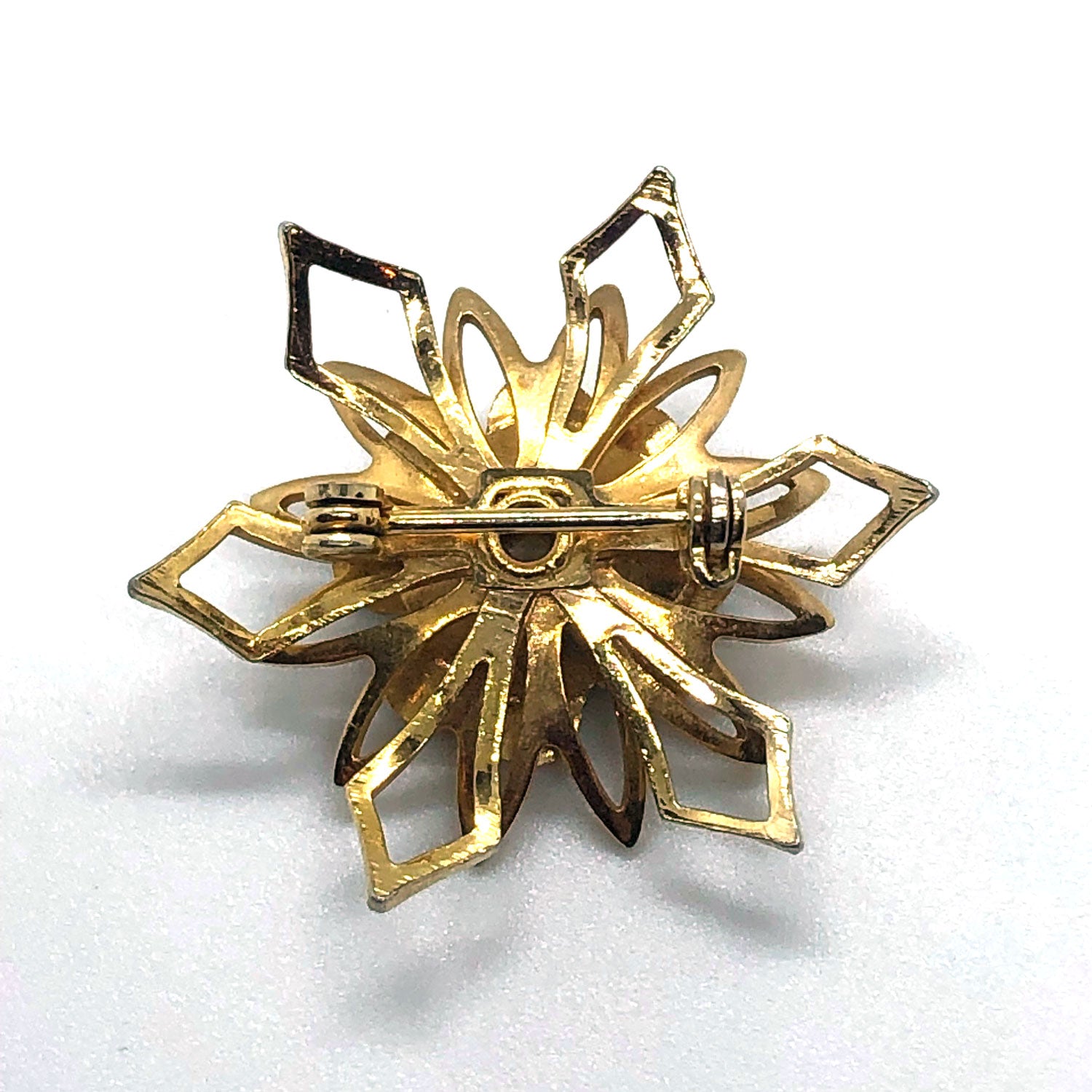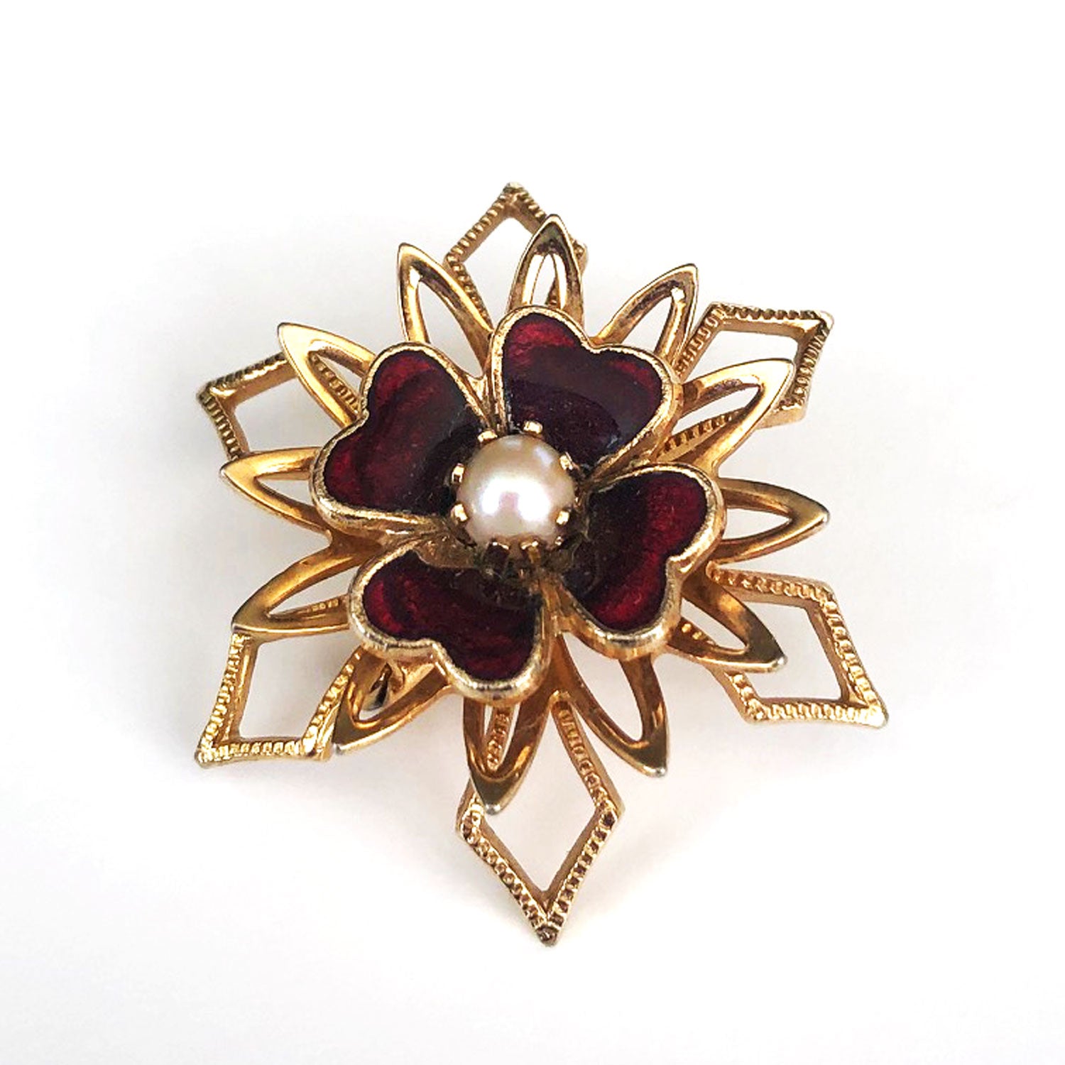 Small flower collar pin with red enamel flower leaf clover and pearl center.