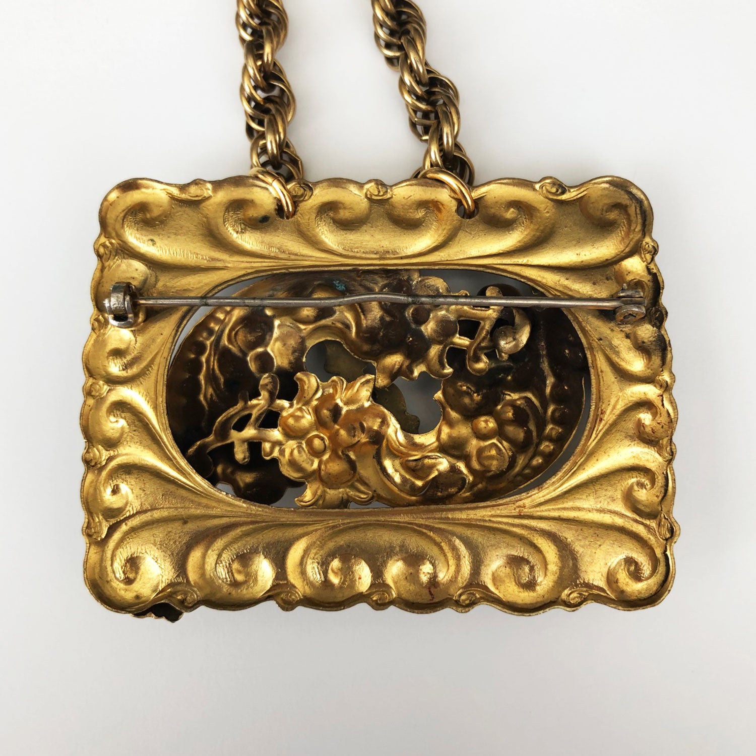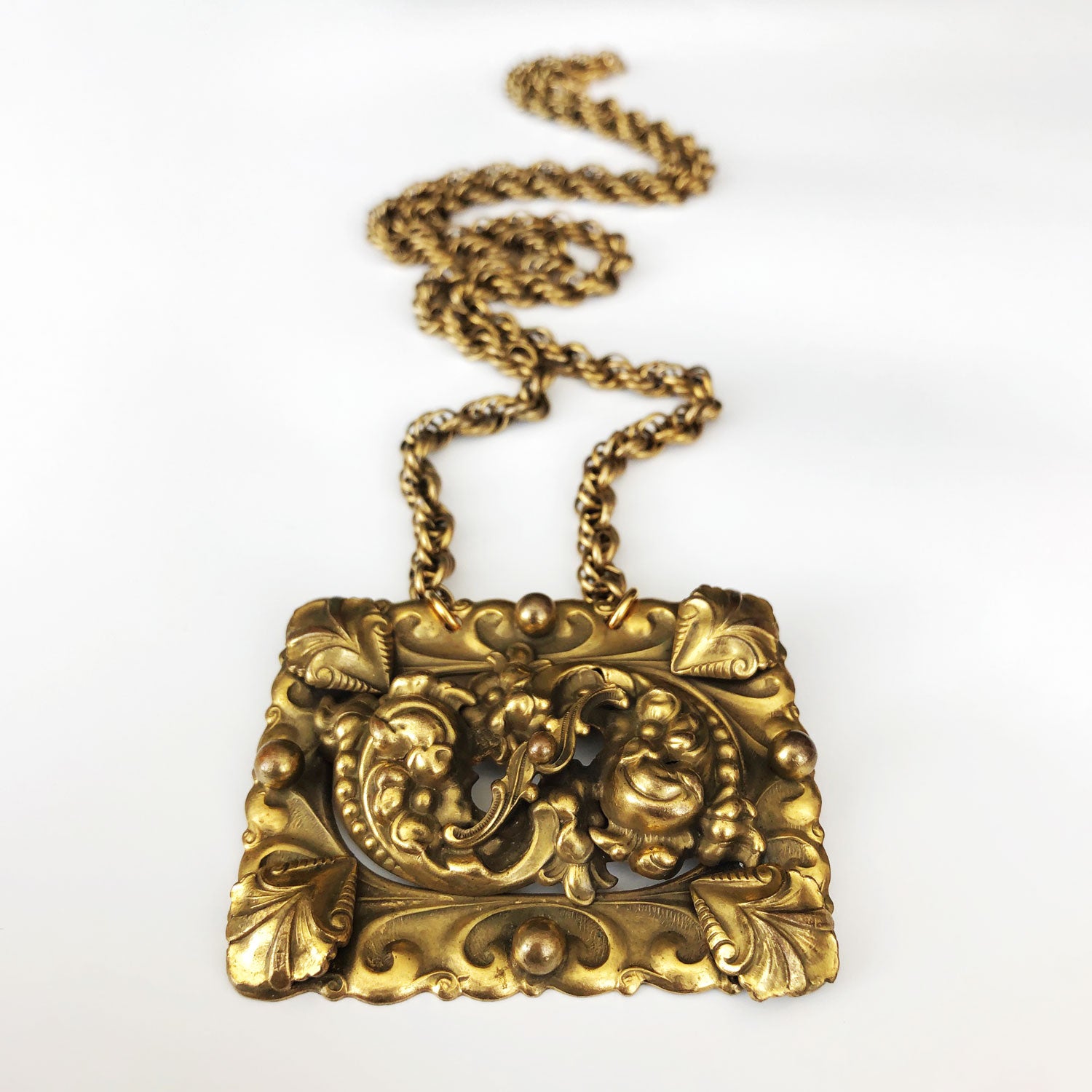 Rectangular vintage brooch with pierced floral design on heavy gold-tone rope chain, circa the 1930s–40s.