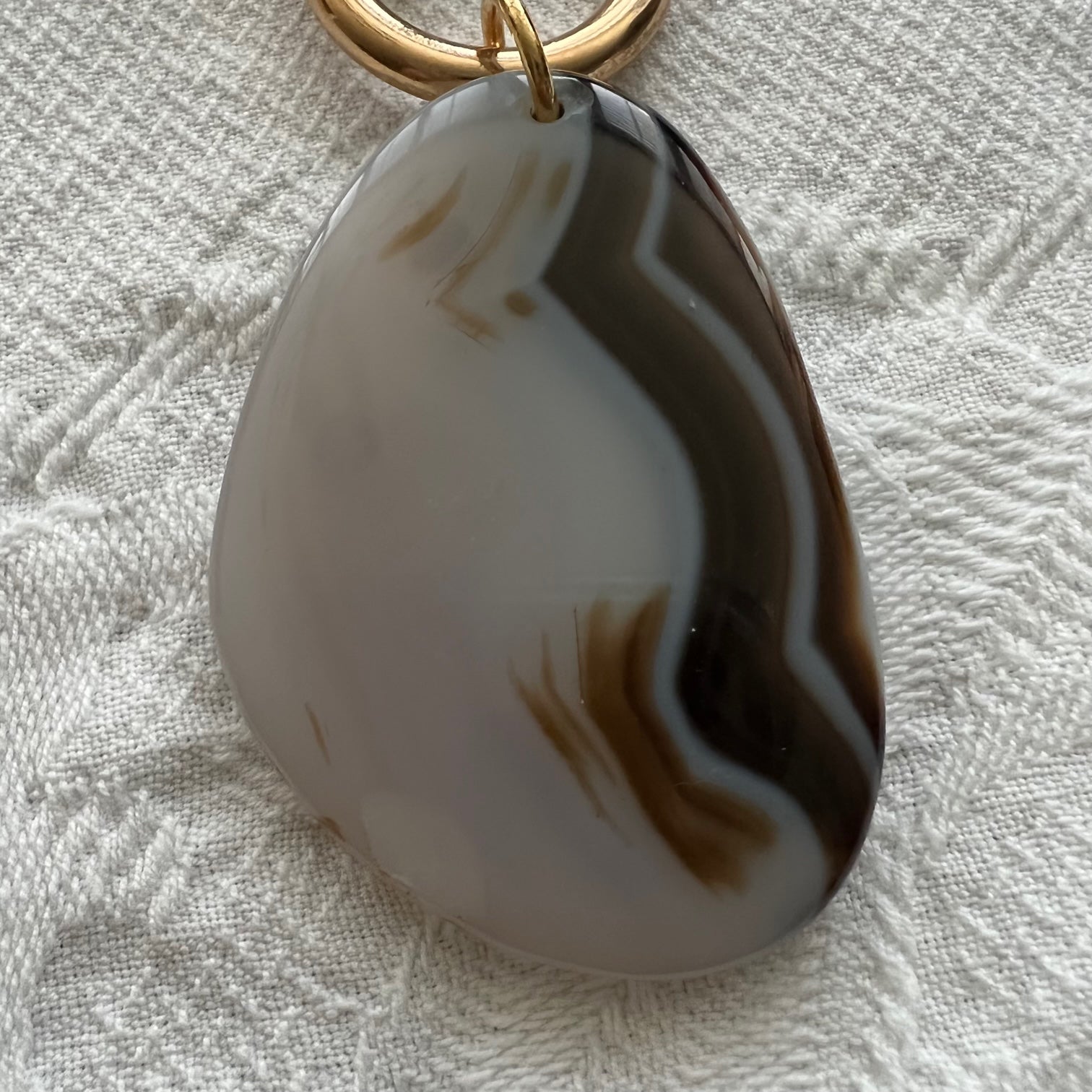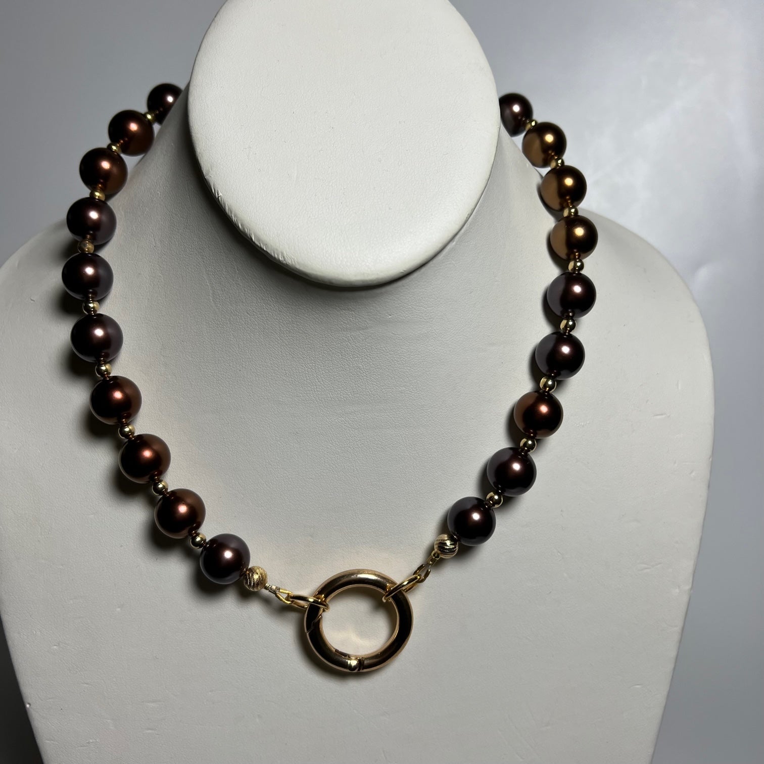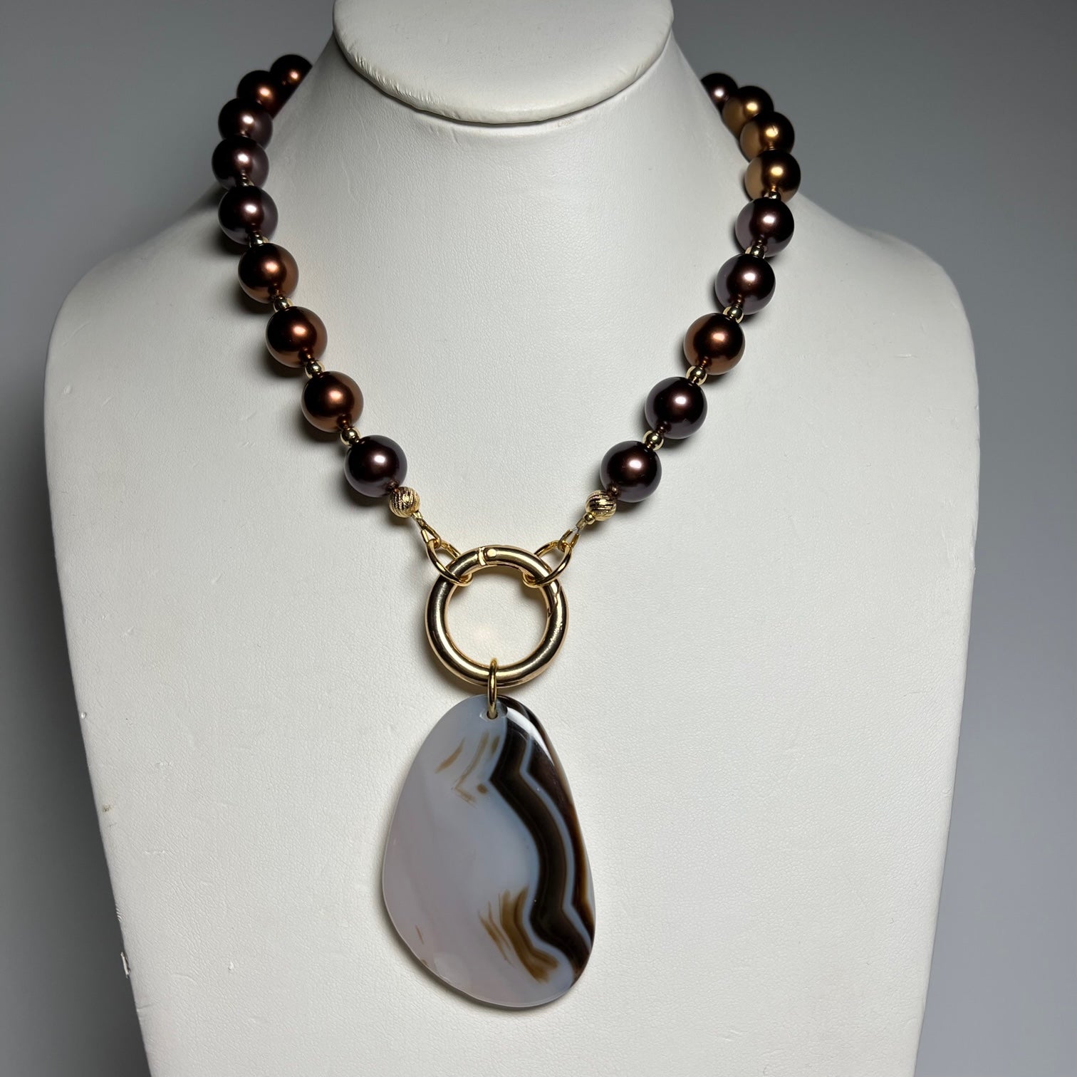 12MM tri-colored brown shell pearl necklace with gold filled beads and agate enhancer. The enhancer can easily be removed to wear the necklace alone. The gold connector is easy to maneuver allowing you to add your own enhancers or charms. This is a one of a kind piece. Approx. 18"