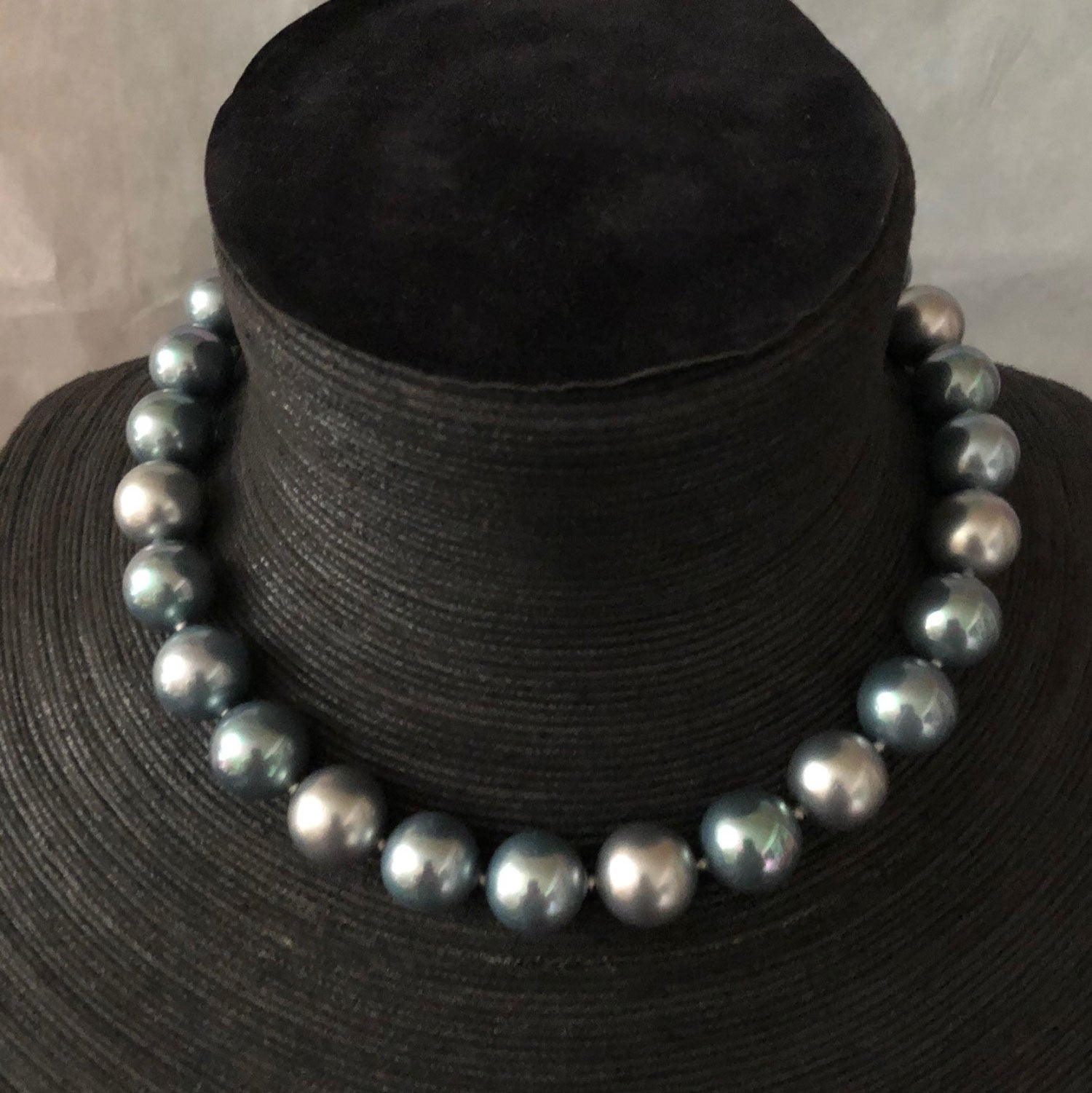 12MM knotted, blue and grey shaded shell pearls with vermeil clasp.