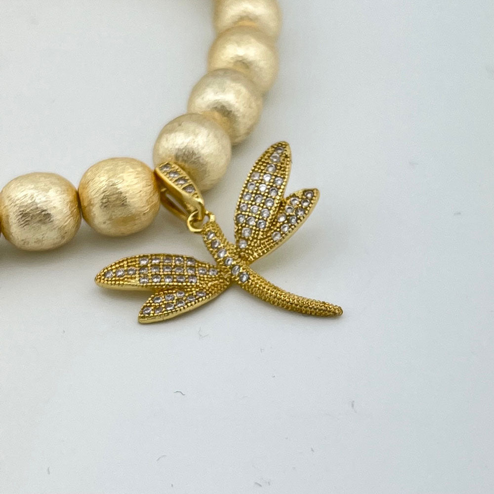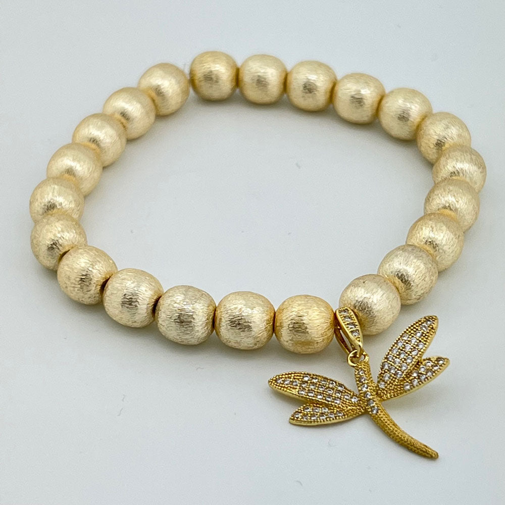 8MM gold plated bead stretch bracelet with gold micro pave CZ dragon fly charm
