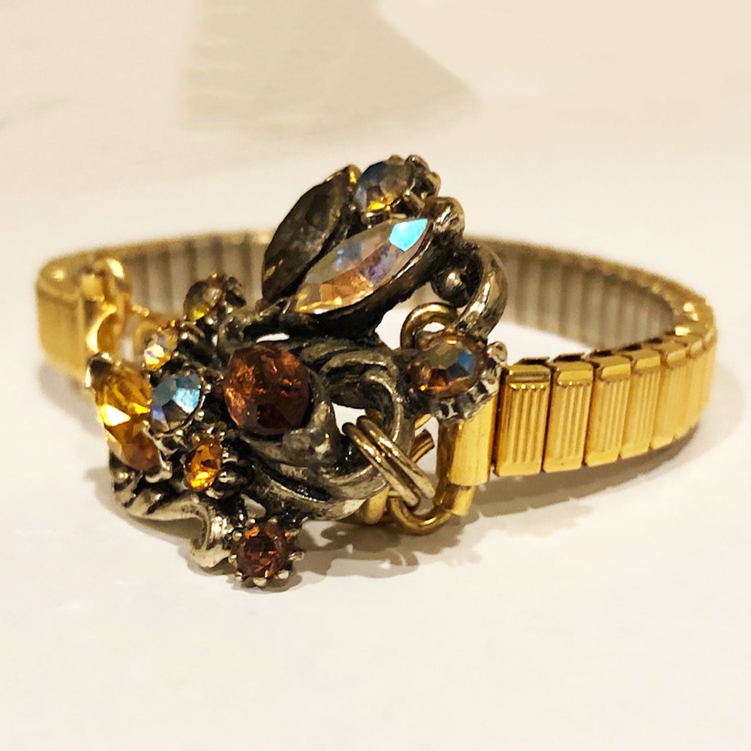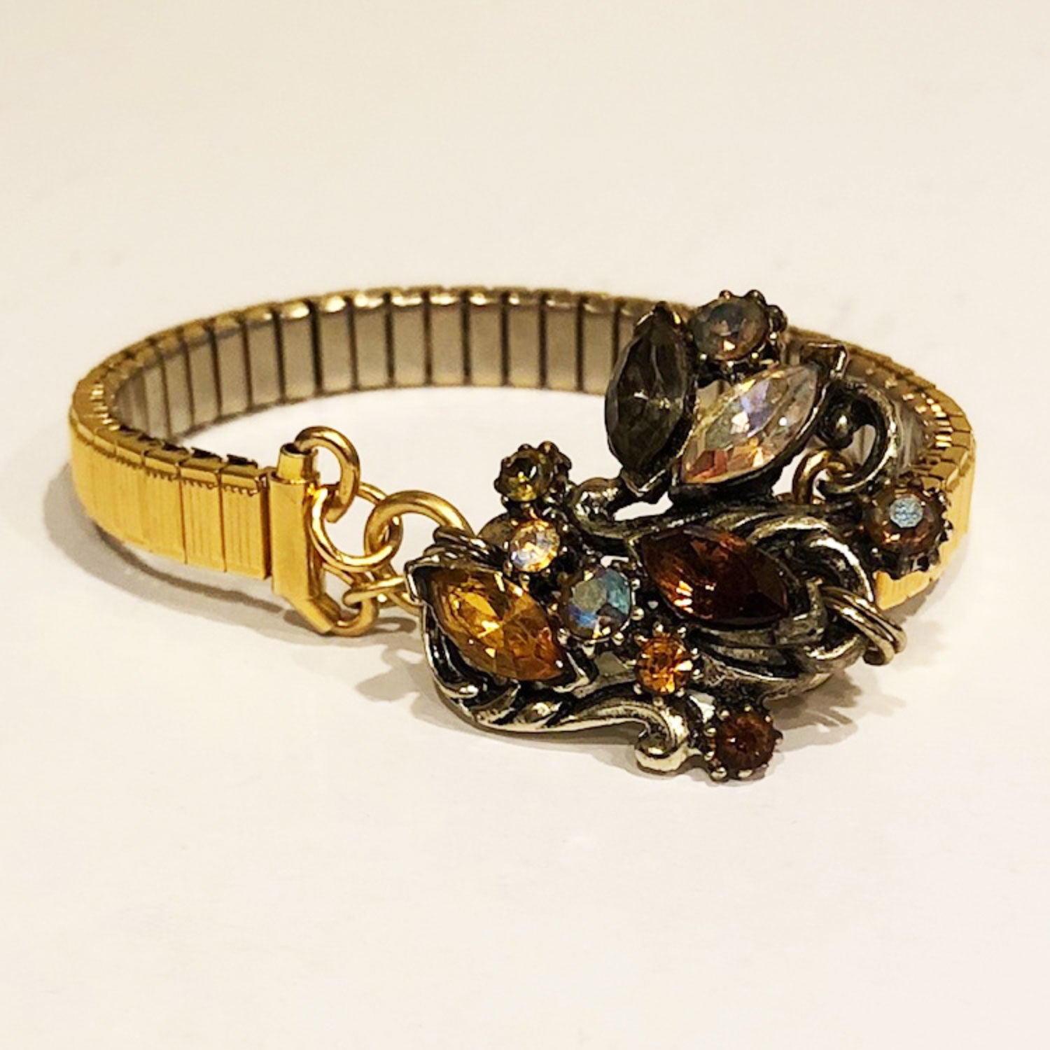 Vintage embossed gold stretch bracelet featuring a spray of autumn color stones, circa the 1950s.