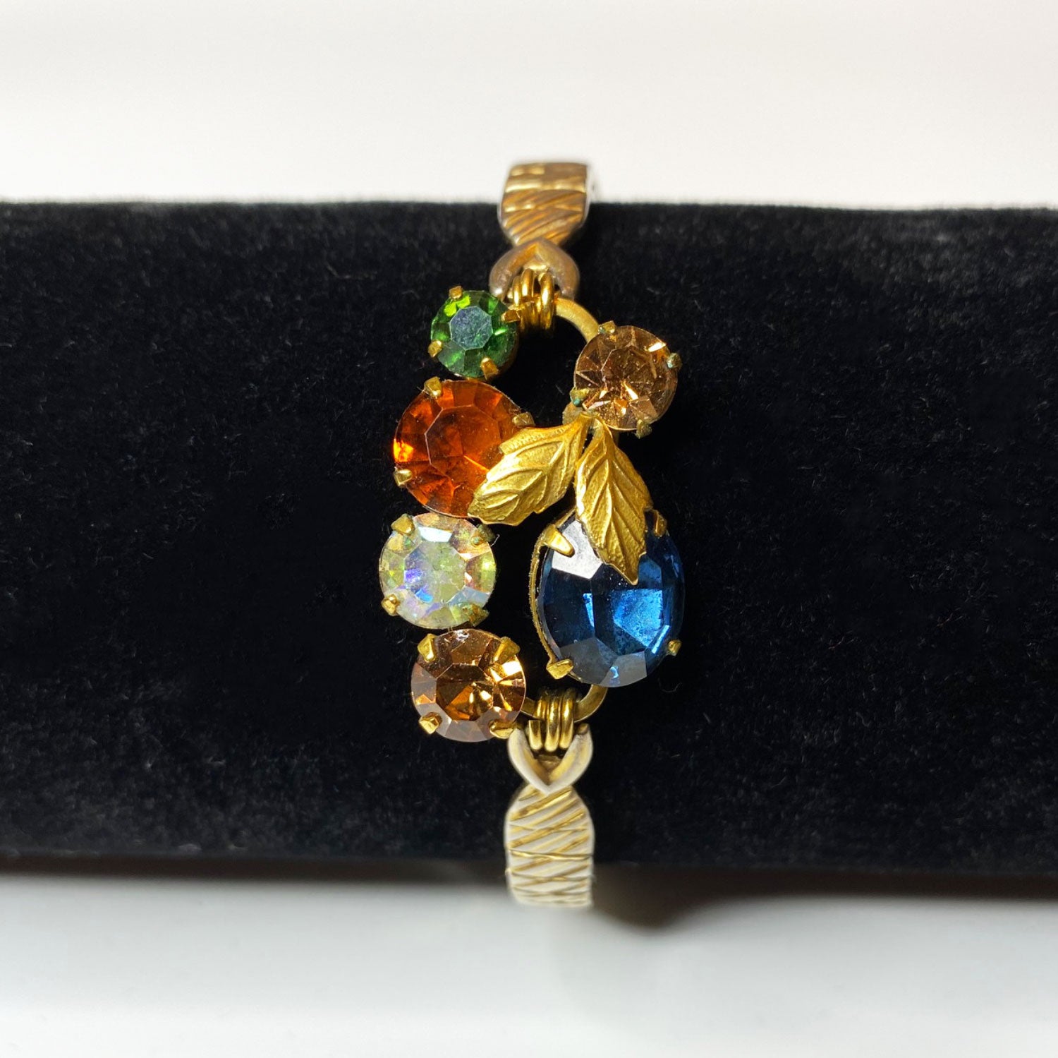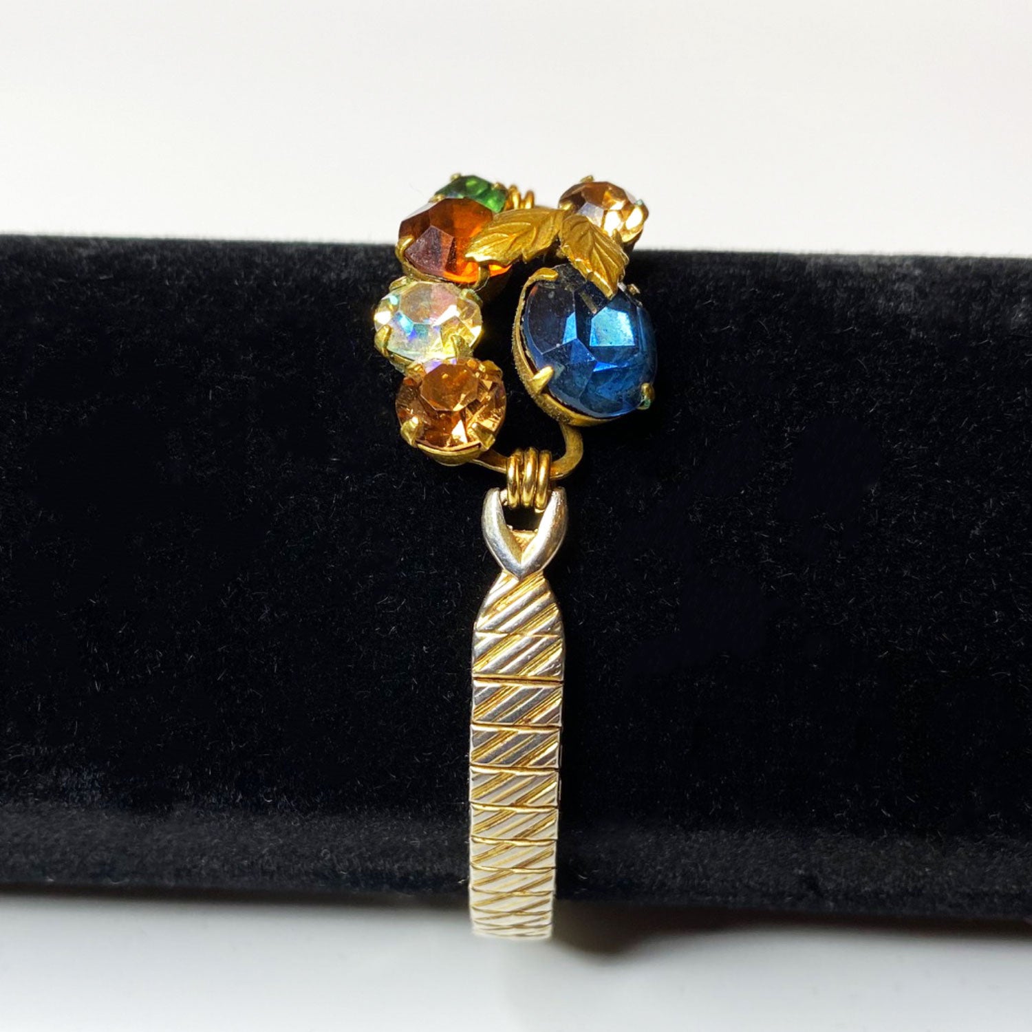 Vintage gold stretch bracelet featuring prong set colorful cluster center, circa the 1940s-50s.