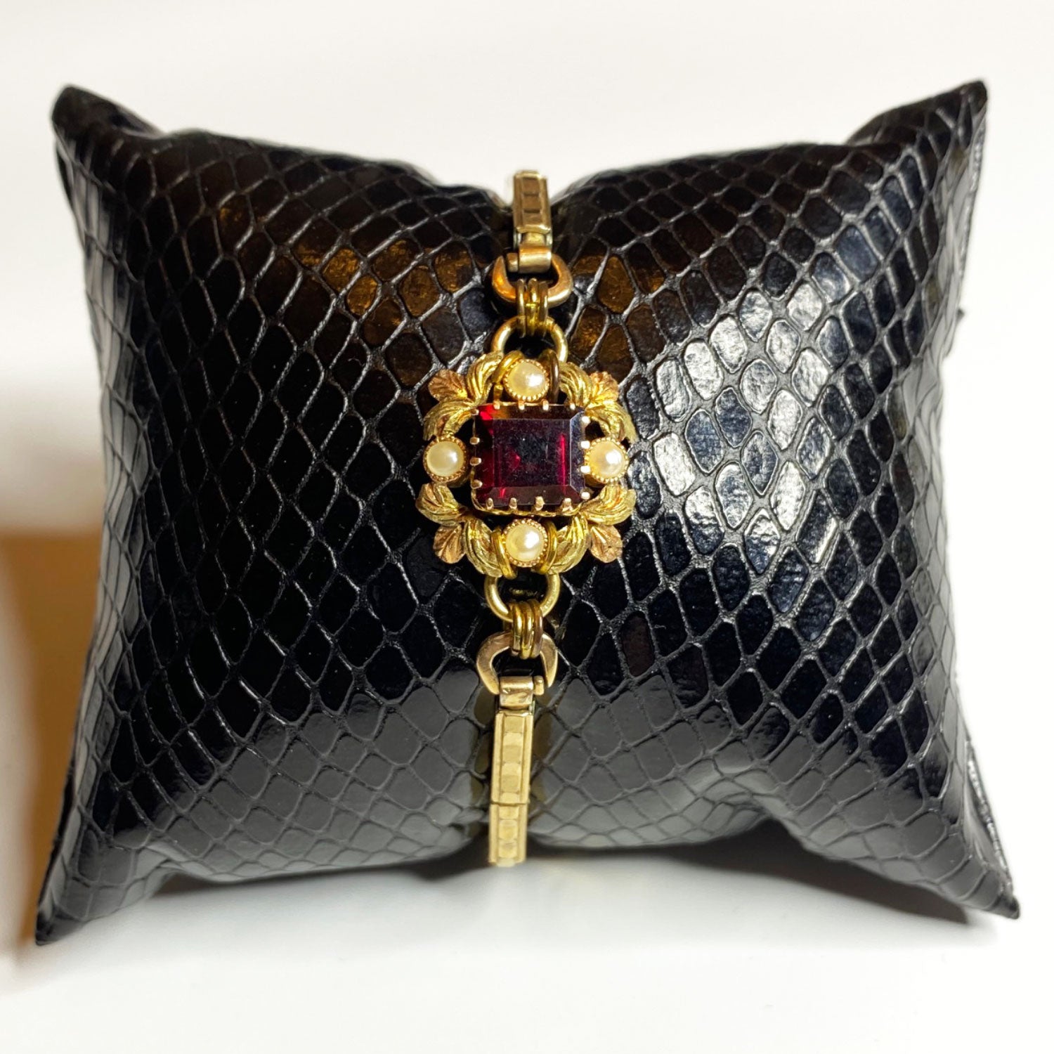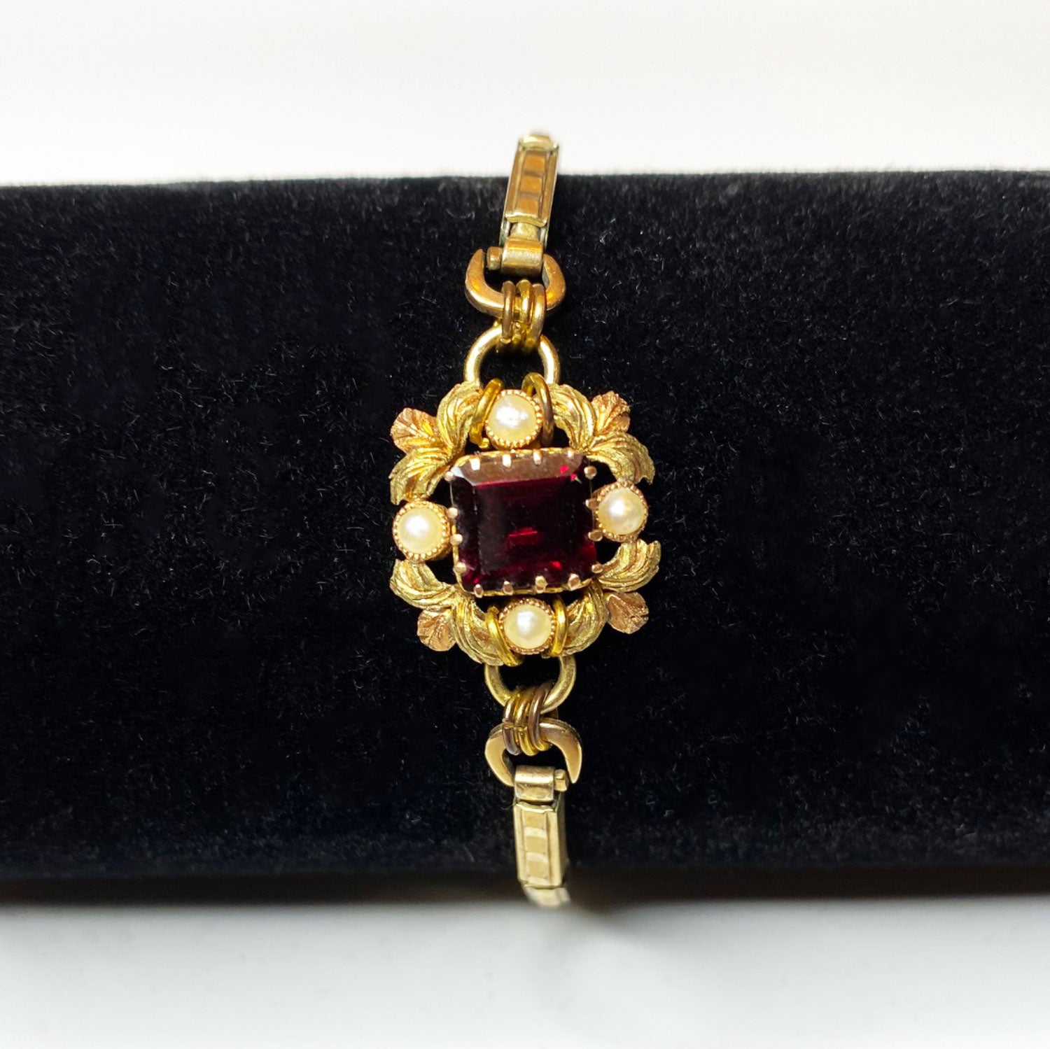 Vintage gold embossed stretch bracelet, mid-century finding featuring gold leaf motif with a prong-set Ruby center with Pearl accents.