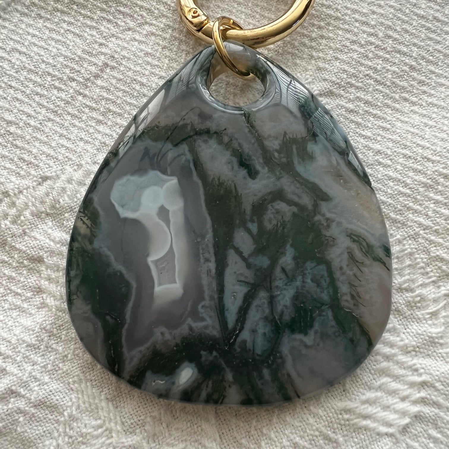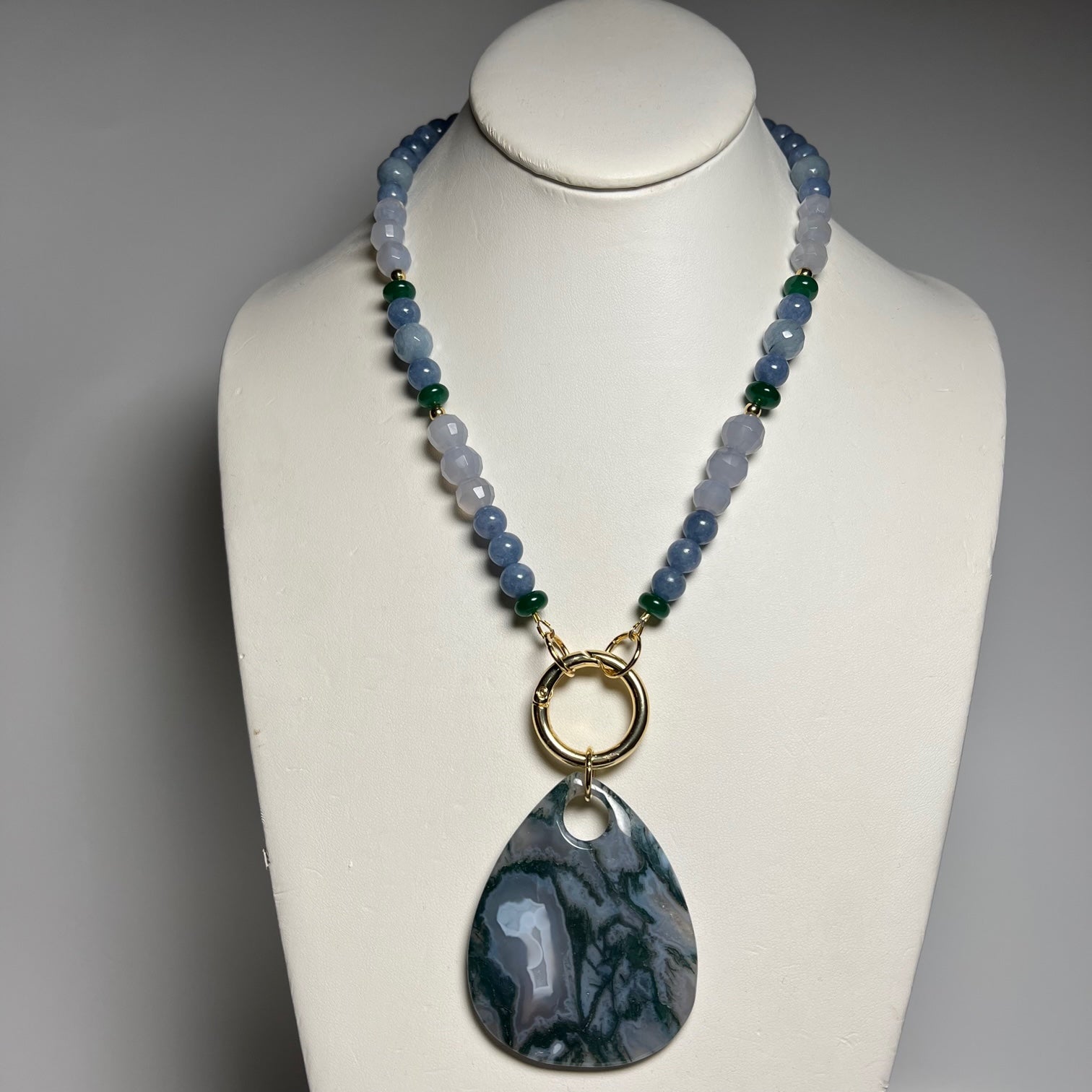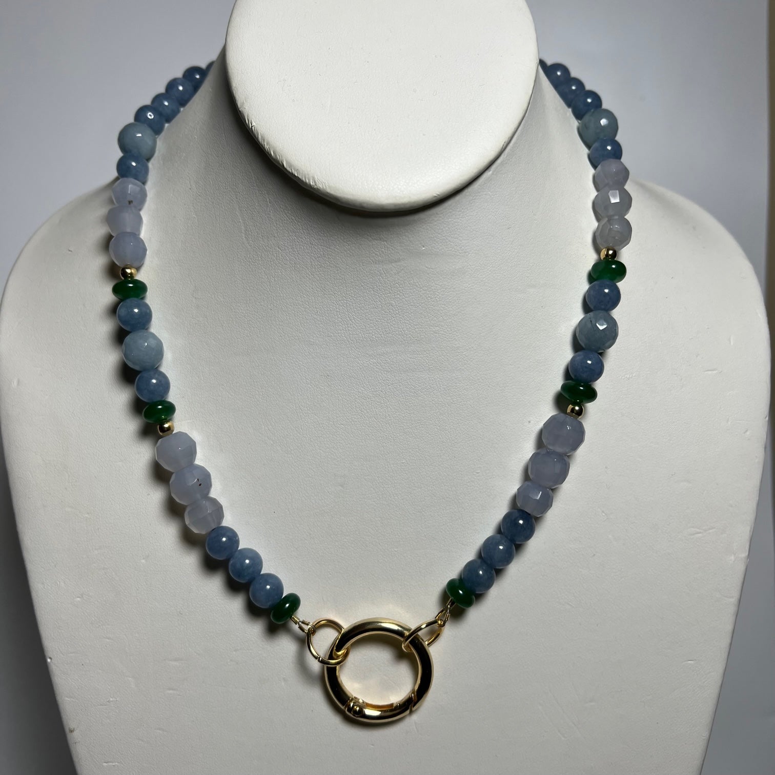 Necklace made from beautiful shades of blue and green chalcedony, jade, and agate beads with gold accents and agate enhancer. The enhancer can easily be removed to wear the necklace alone. The gold connector is easy to maneuver, allowing you to add your own enhancers or charms. This is a one of a kind piece. Approx. 18"