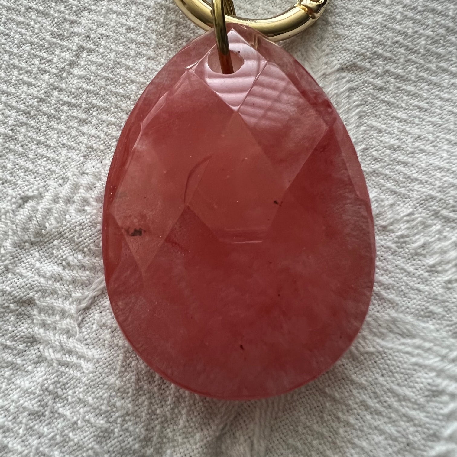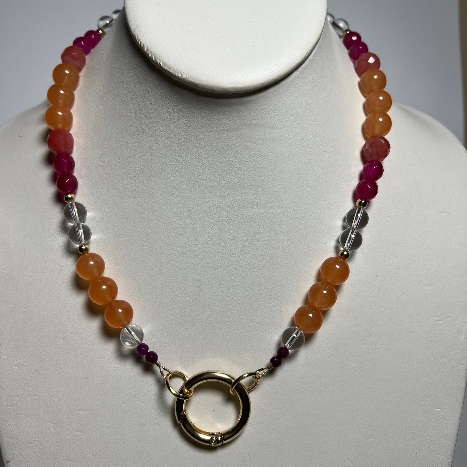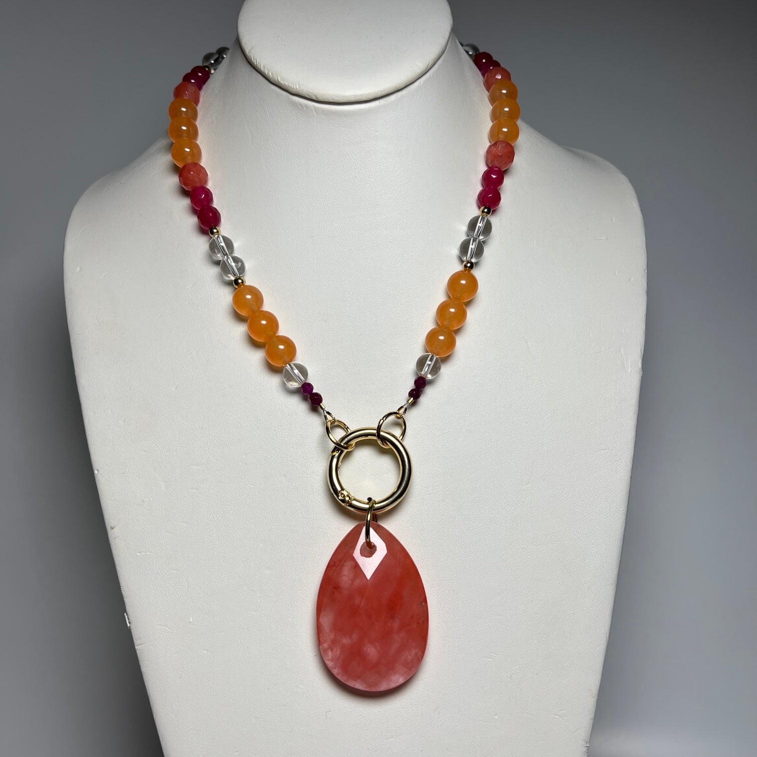 This necklace is comprised of beautiful vibrant shades of oranges, raspberry pink, and clear quartz crystal, agate, jade, crystal and gold beads with a faceted strawberry quartz teardrop shaped enhancer. The enhancer can easily be removed to wear the necklace alone. The gold connector is easy to maneuver allowing you to add your own enhancers or charms. This is a one of a kind piece. Approx. 18"