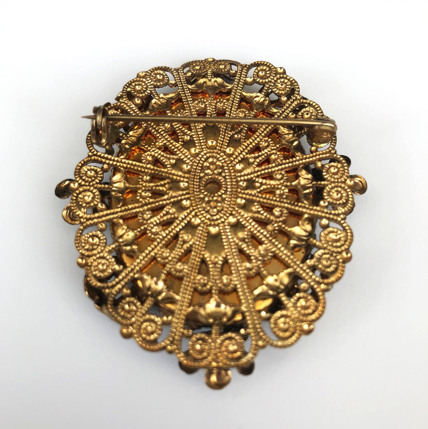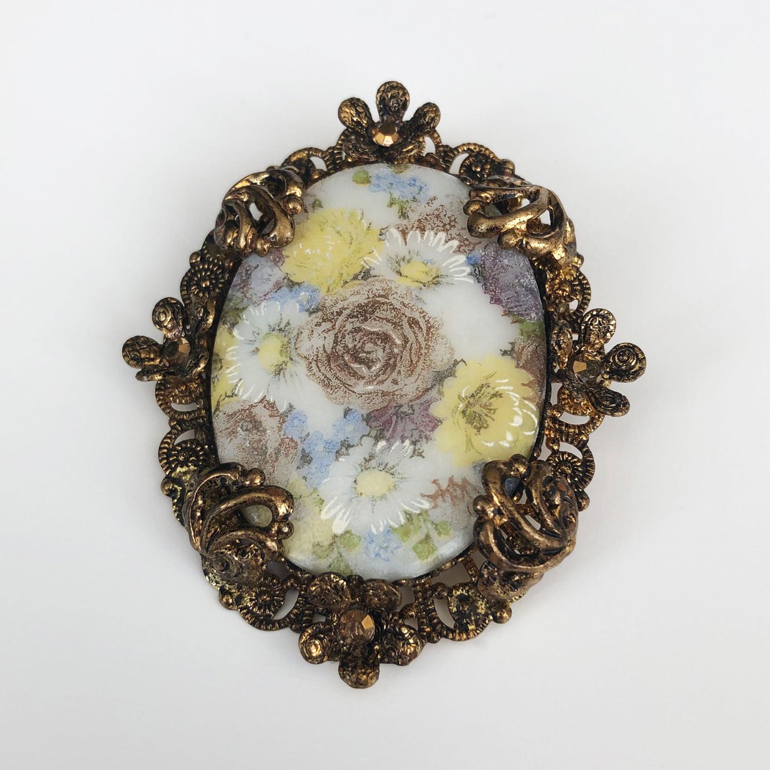 Early to mid-century painted porcelain brooch encapsulated with in heavy antique gold mount.