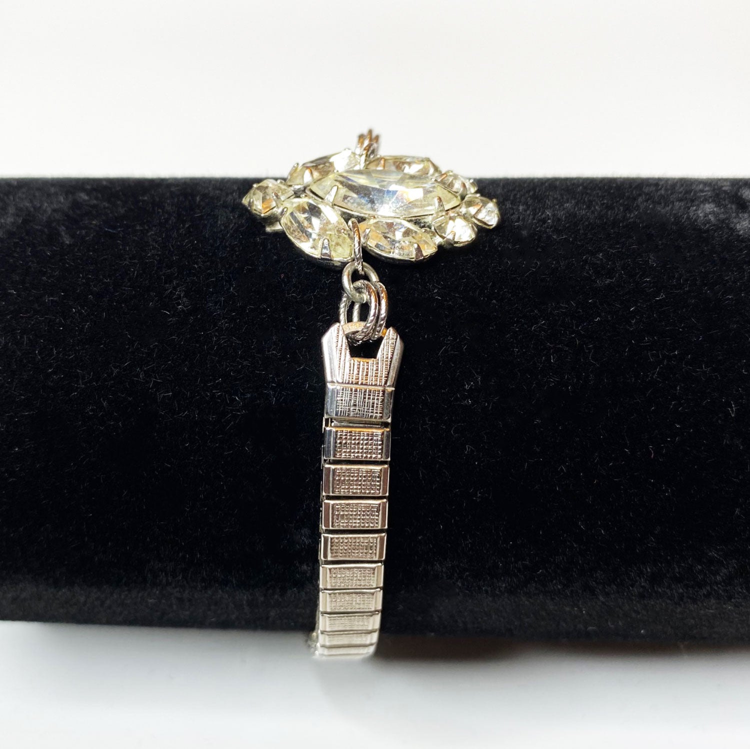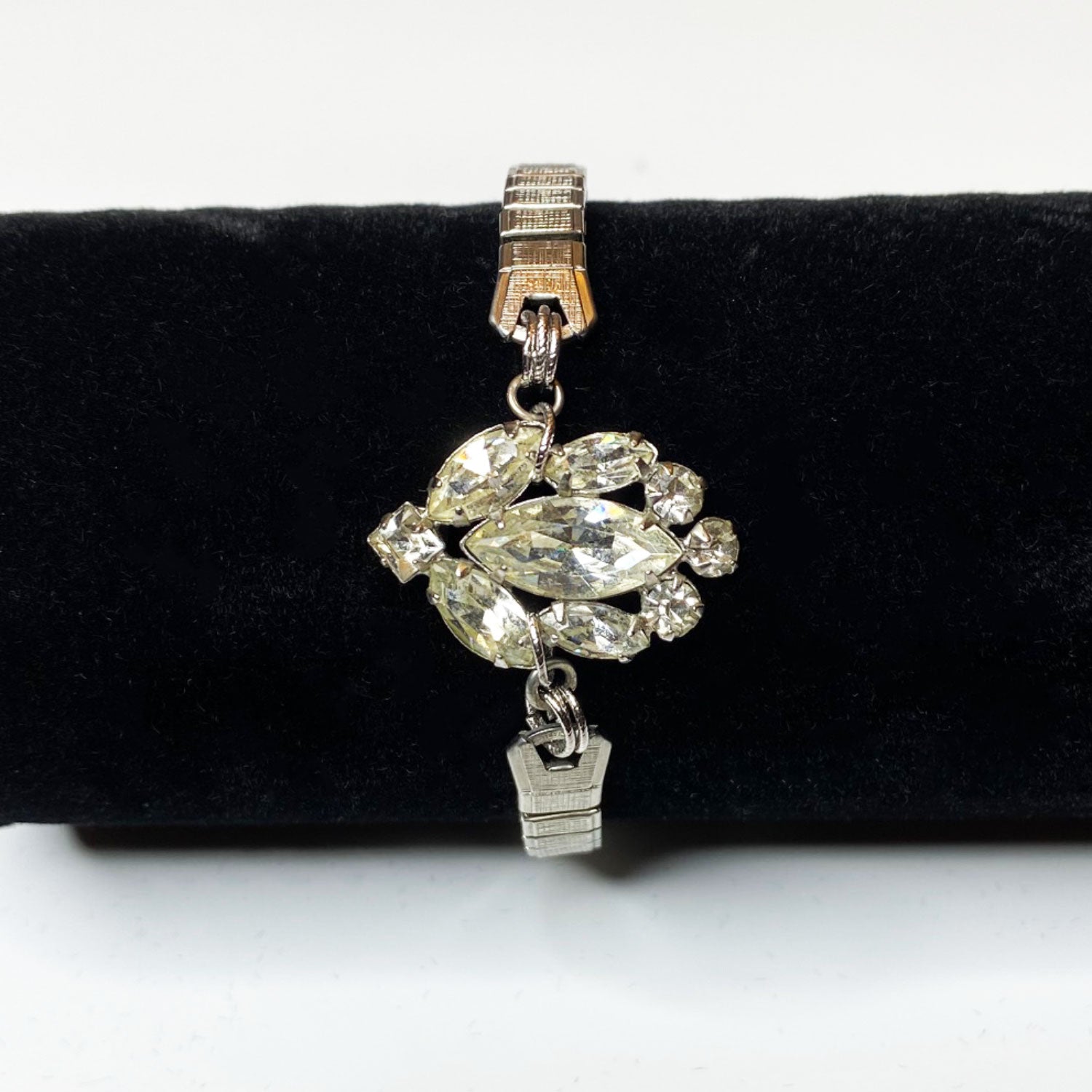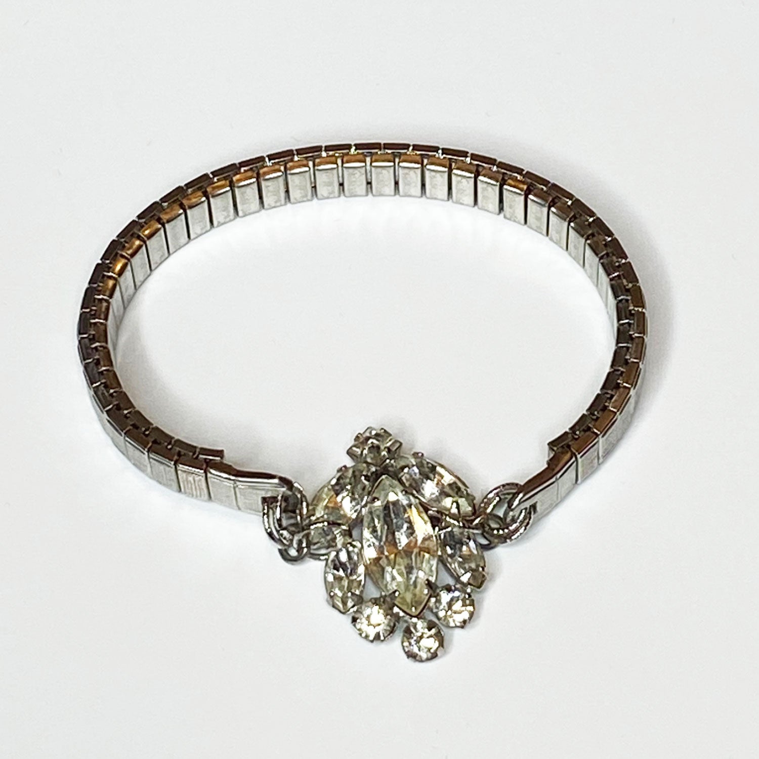 Vintage silver stretch bracelet, featuring oval prong-set rhinestones, circa the 1940s–50s.