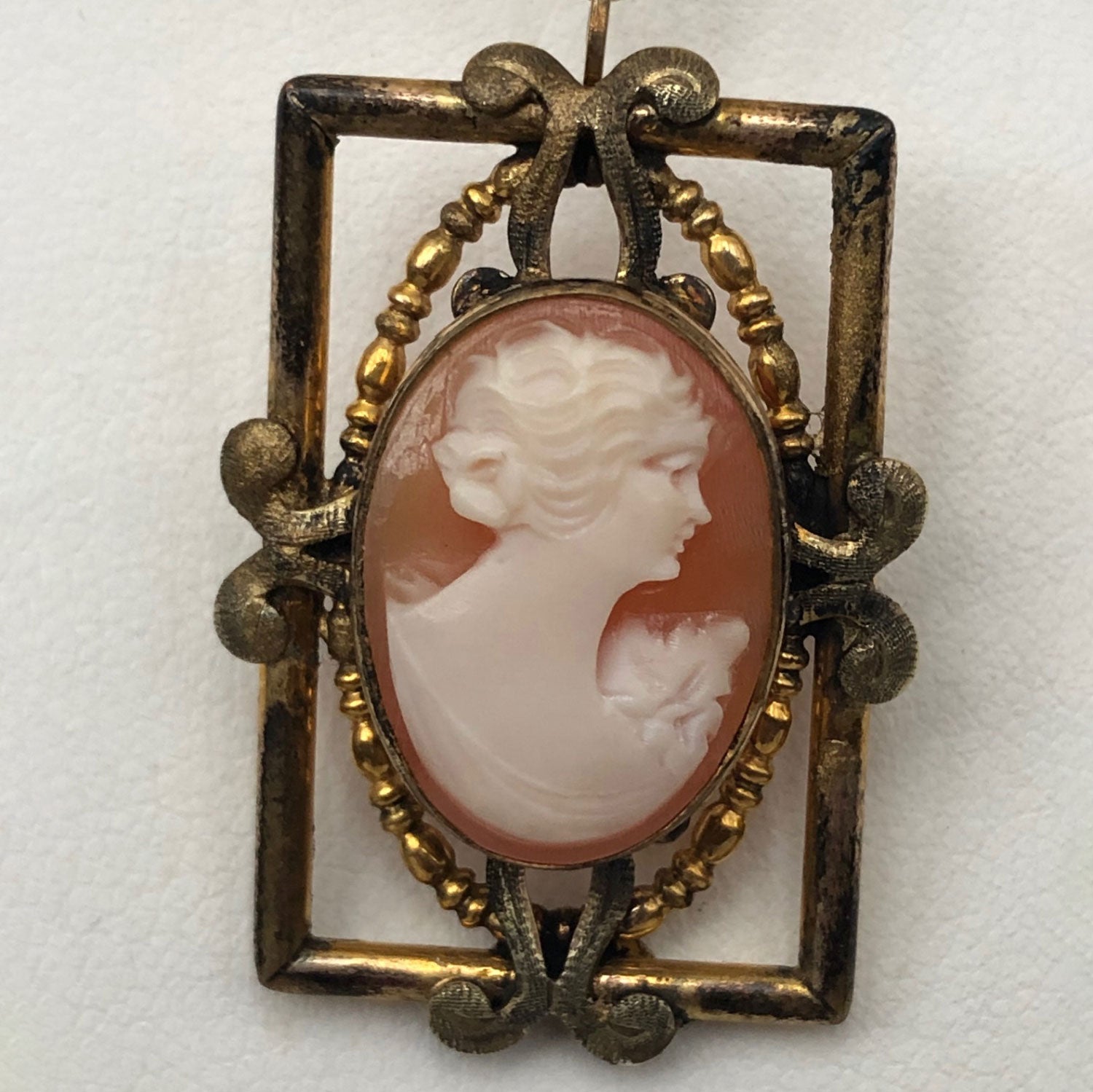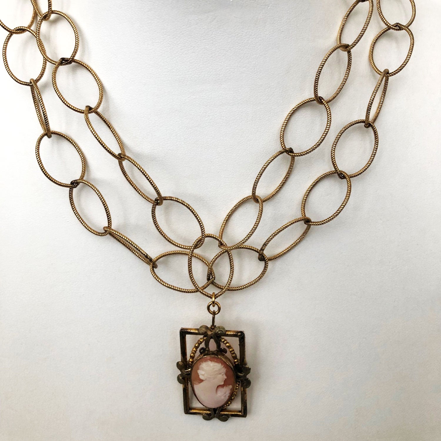 12Kt gold filled vintage cameo brooch hangs from 14Kt gold filled textured oval link, double chain with vermeil toggle closure.