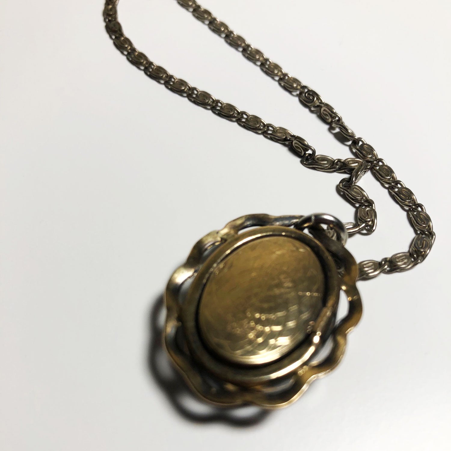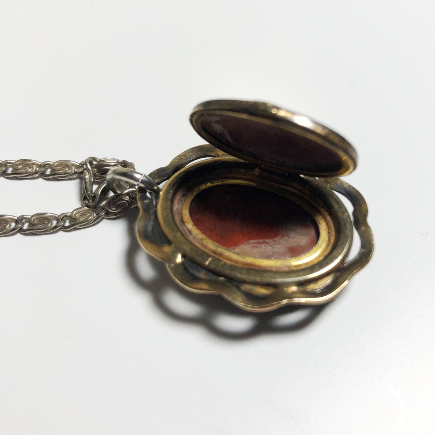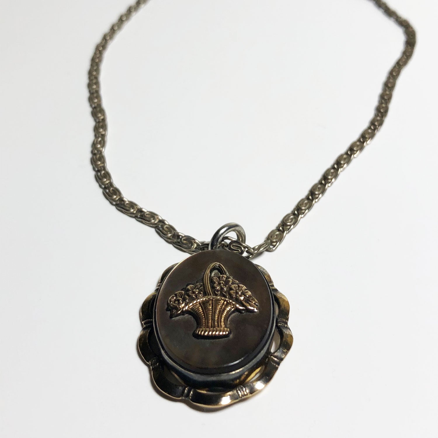 12kt gold on sterling locket. The face features a mother of pearl oval with a flower basket.
