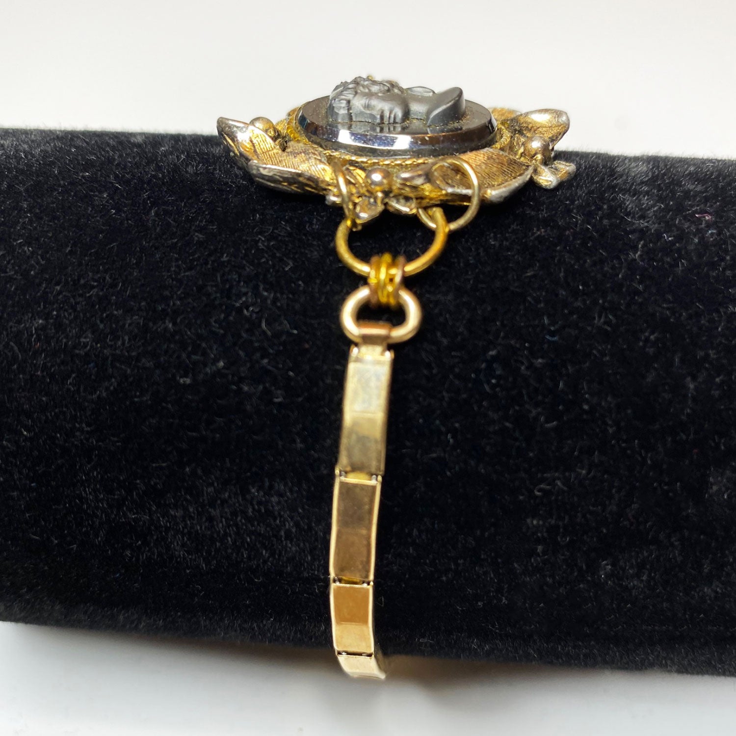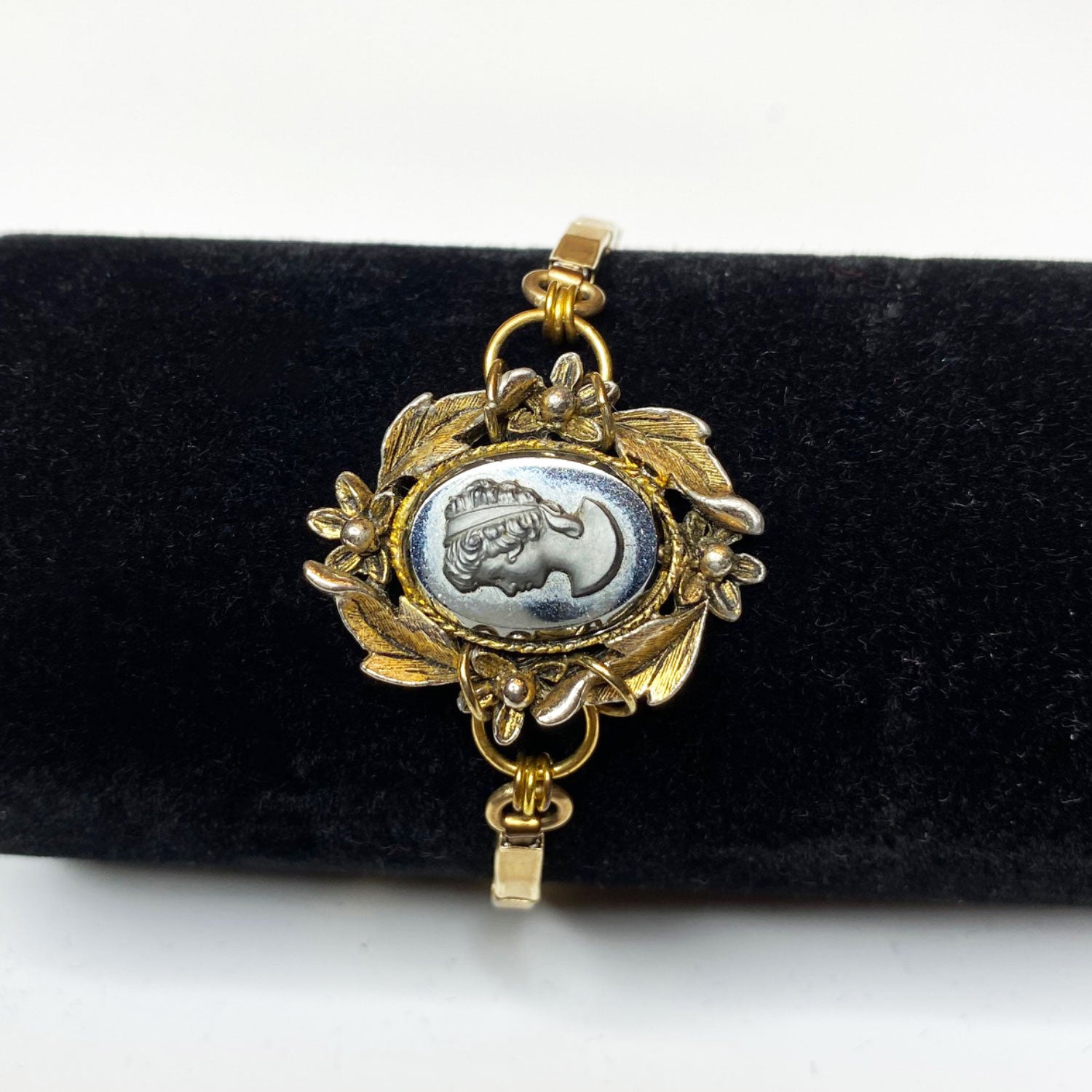 Vintage thin gold stretch bracelet featuring a raised oval cameo set in a flower and leaf motif.