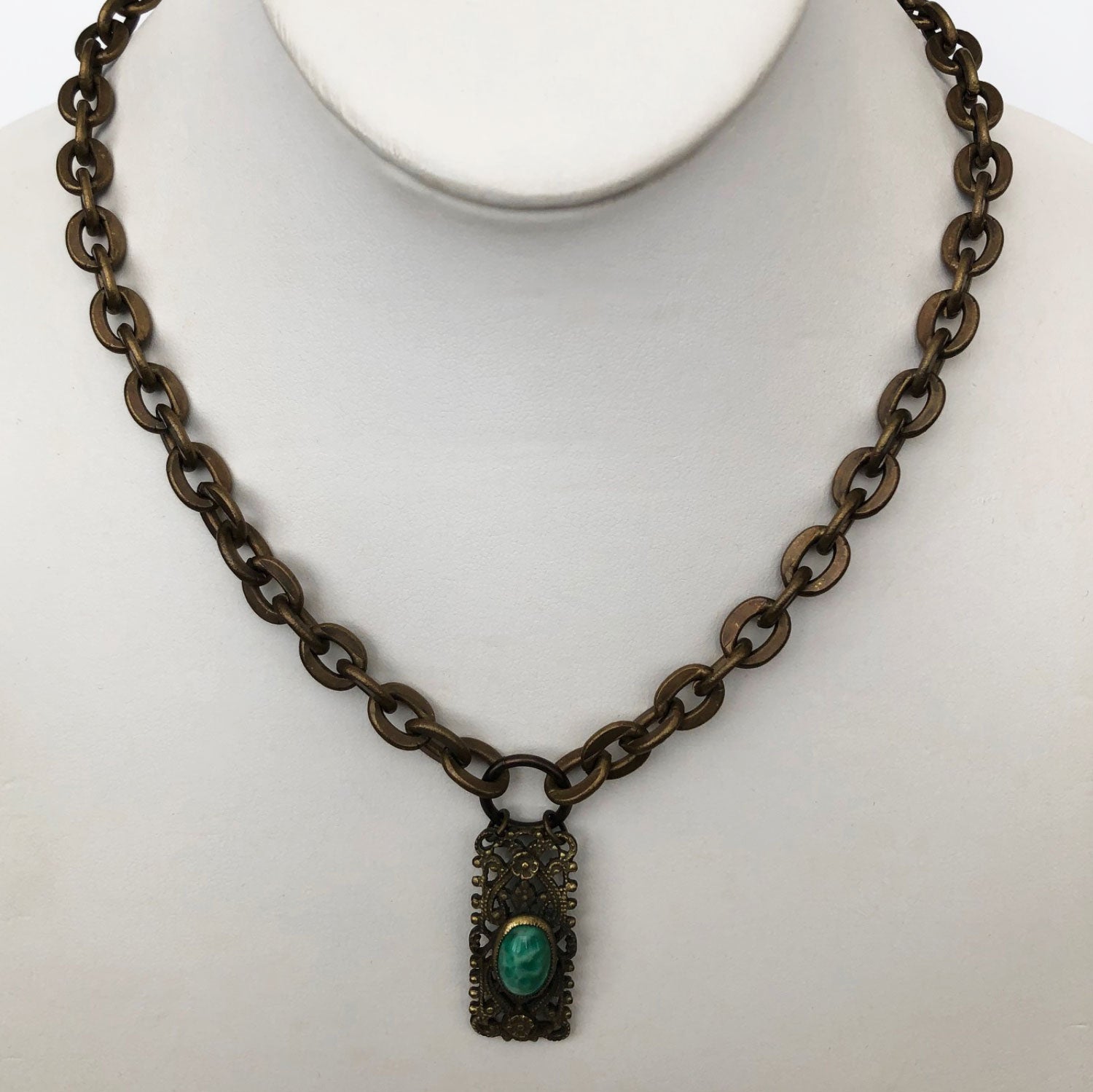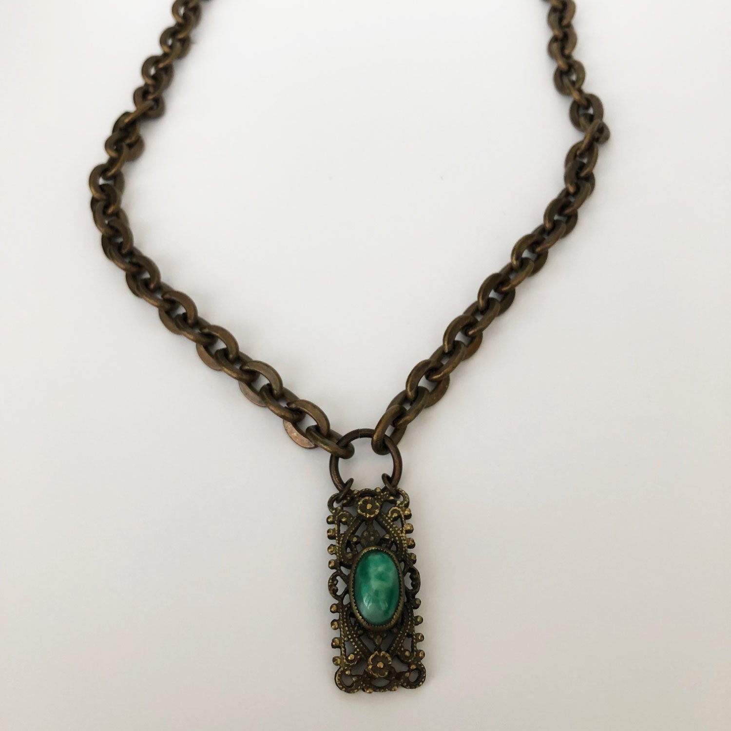 Antique gold filagree drop with bezel set cabochon green stone on antique gold chain.