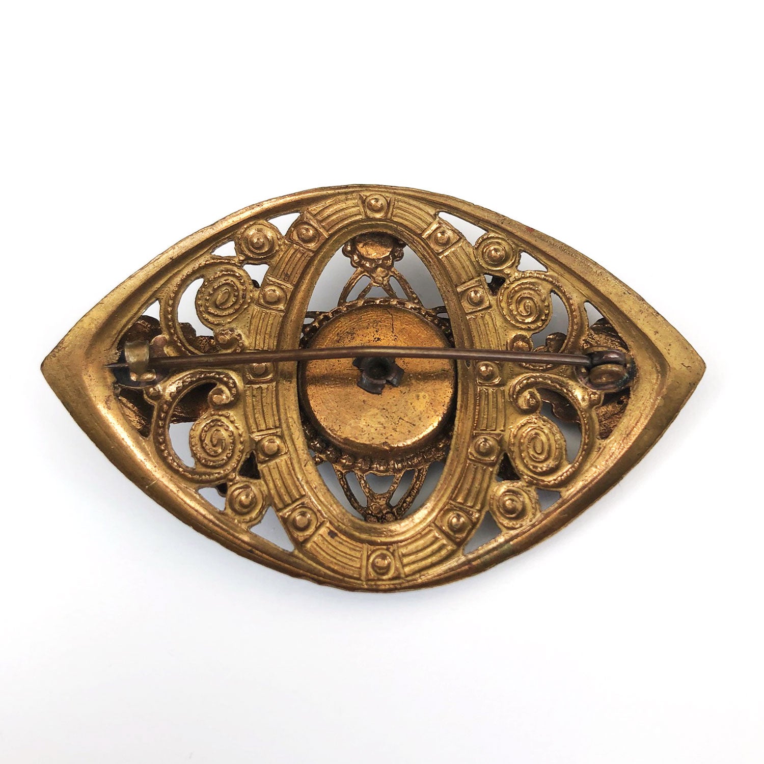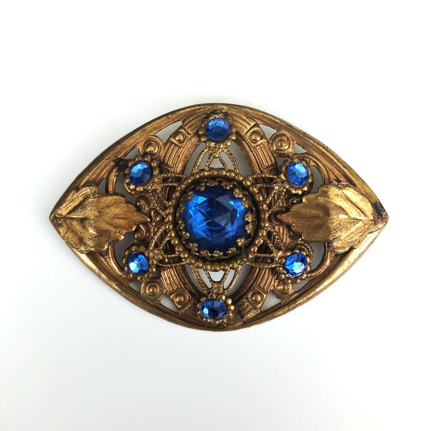 Victorian brooch featuring antique gold filagree work with blue stones.