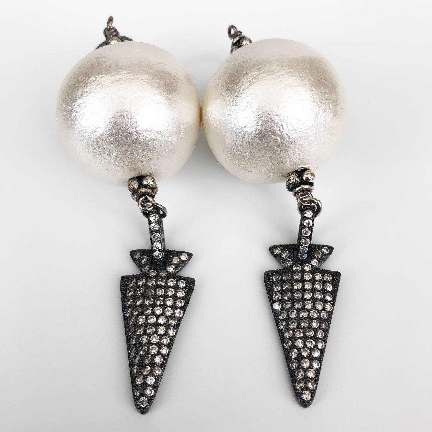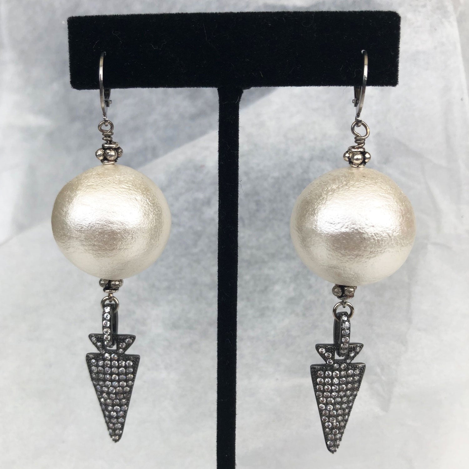 Large Cotton Pearl with CZ arrow dangle. Lever back closure.