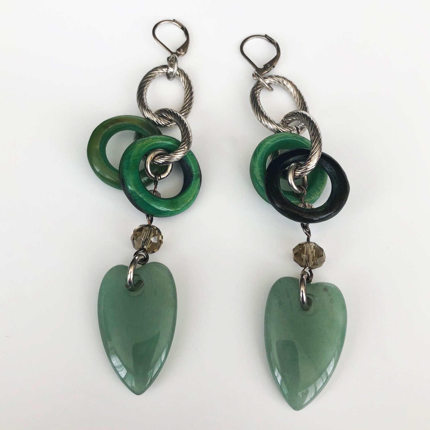 Silver link dangle earrings with green acrylic circles, crystal, and jade hearts.
