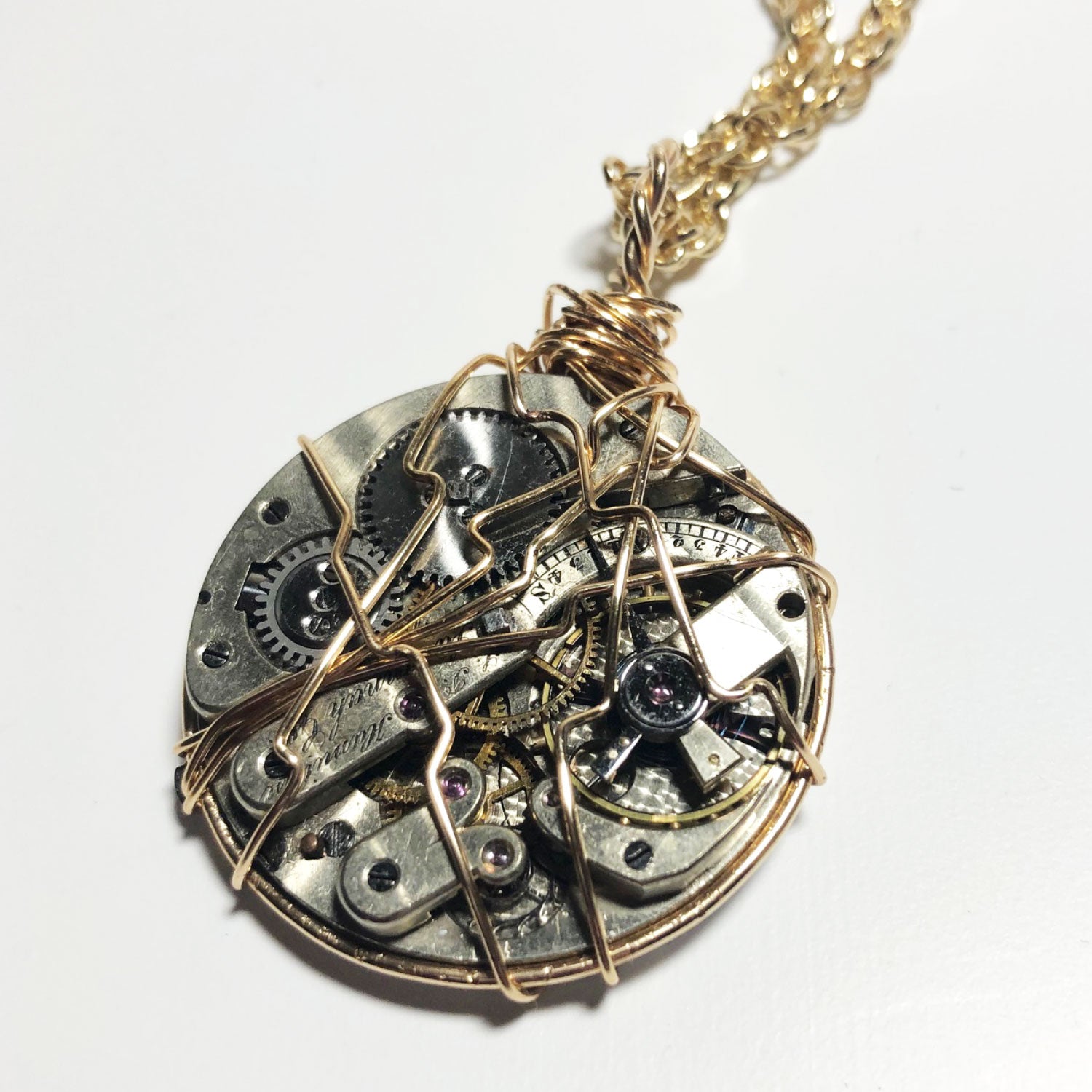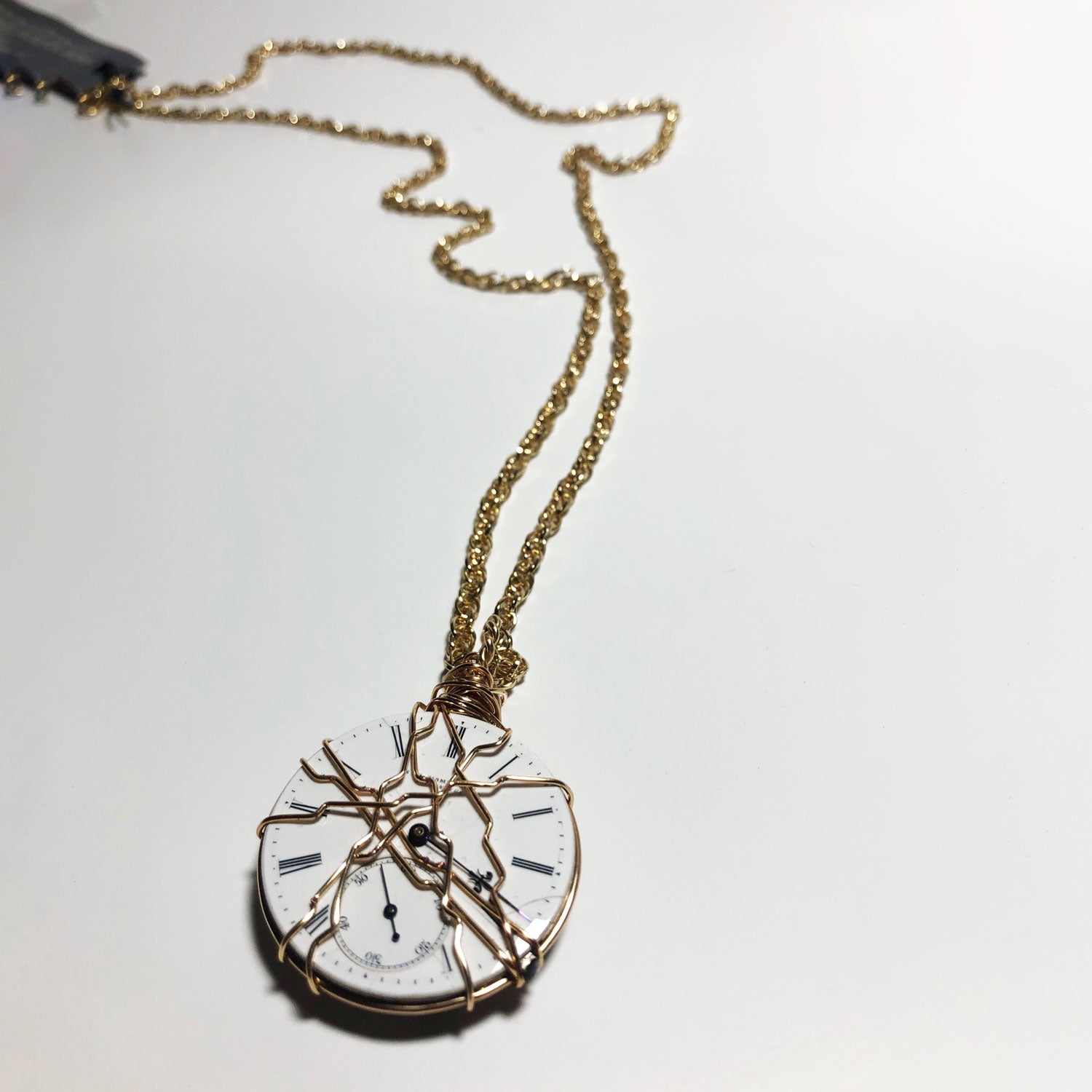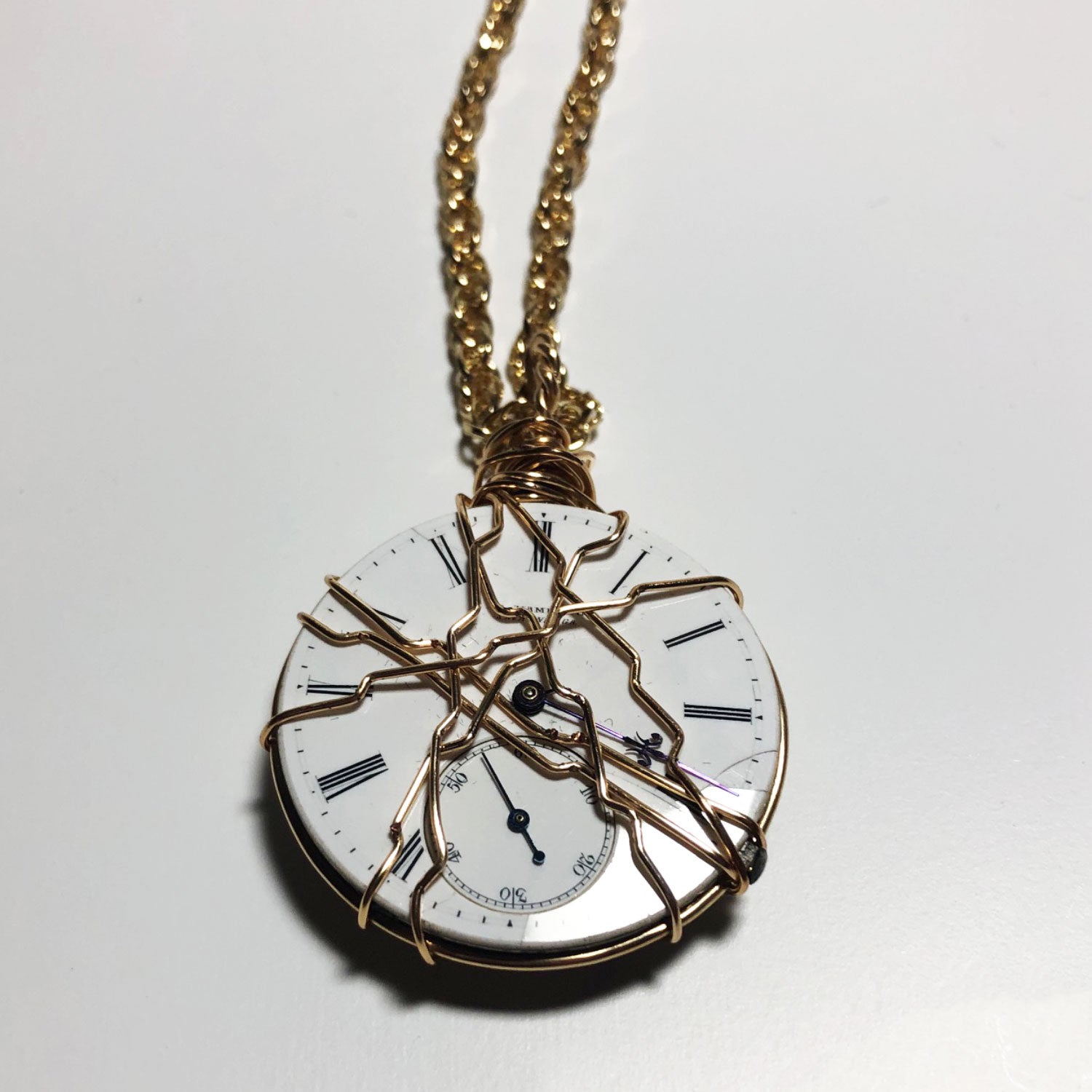 Vintage watch hard wrapped with 14K gold-filled wire on a chain. Can be doubled and worn short.