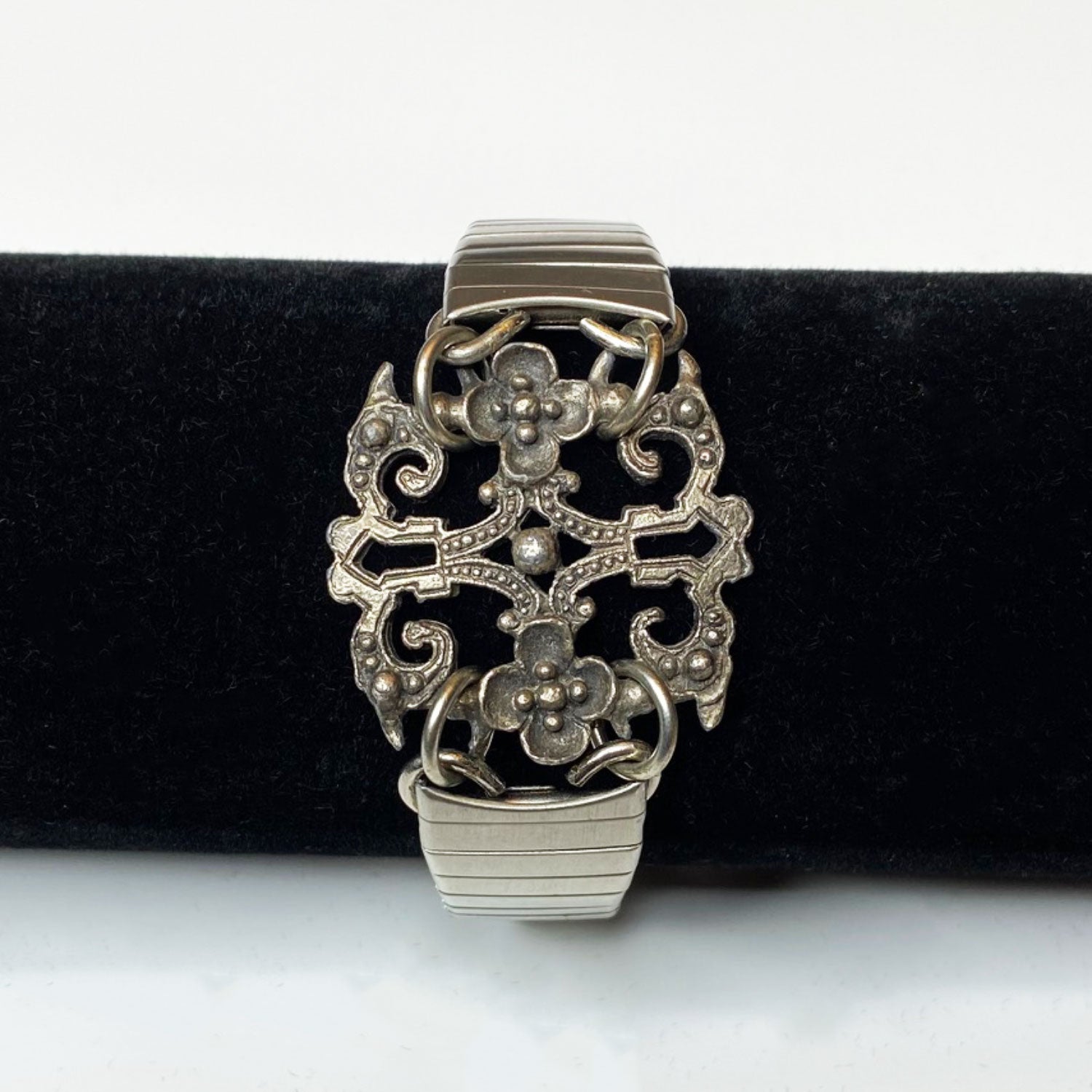 Vintage wide satin silver bracelet with stamped flowers and cut-out antique silver arrow design.