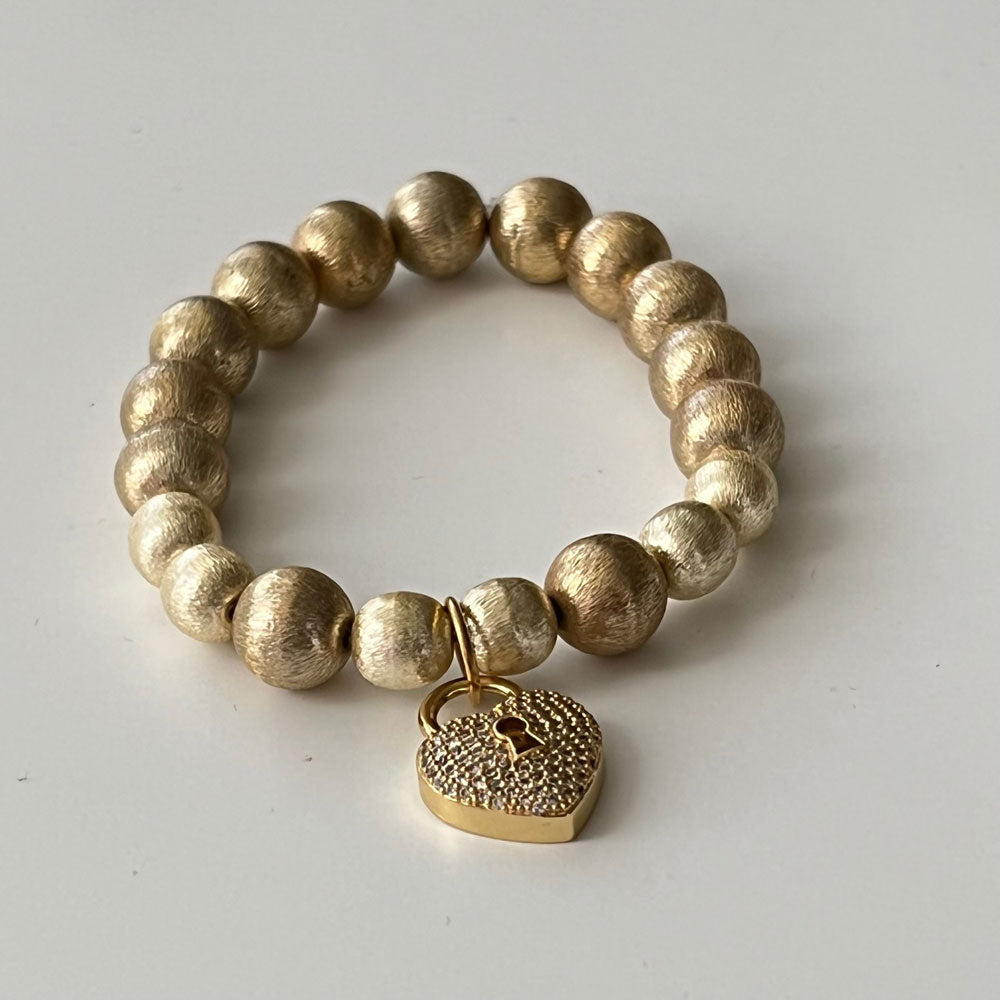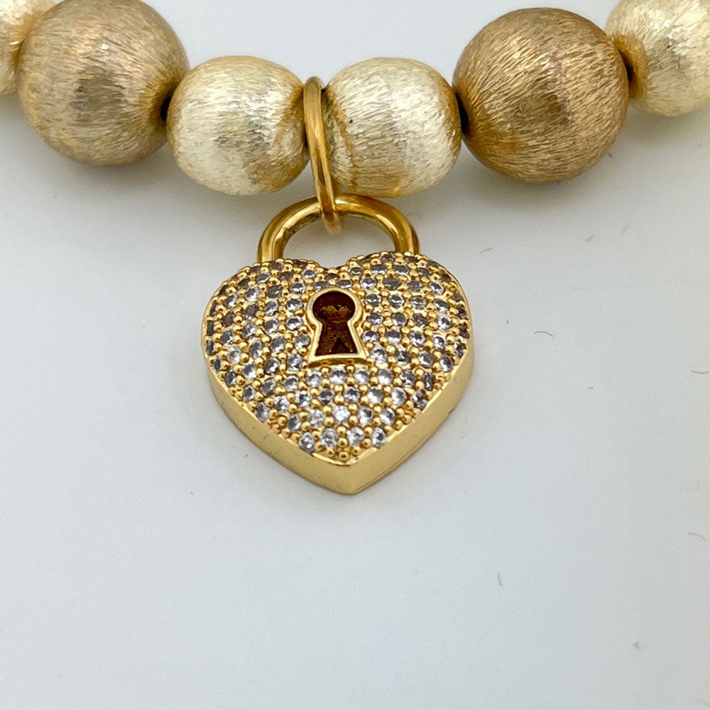 8MM and 10MM gold plated round bead stretch bracelet with micro pave CZ heart/lock charm.