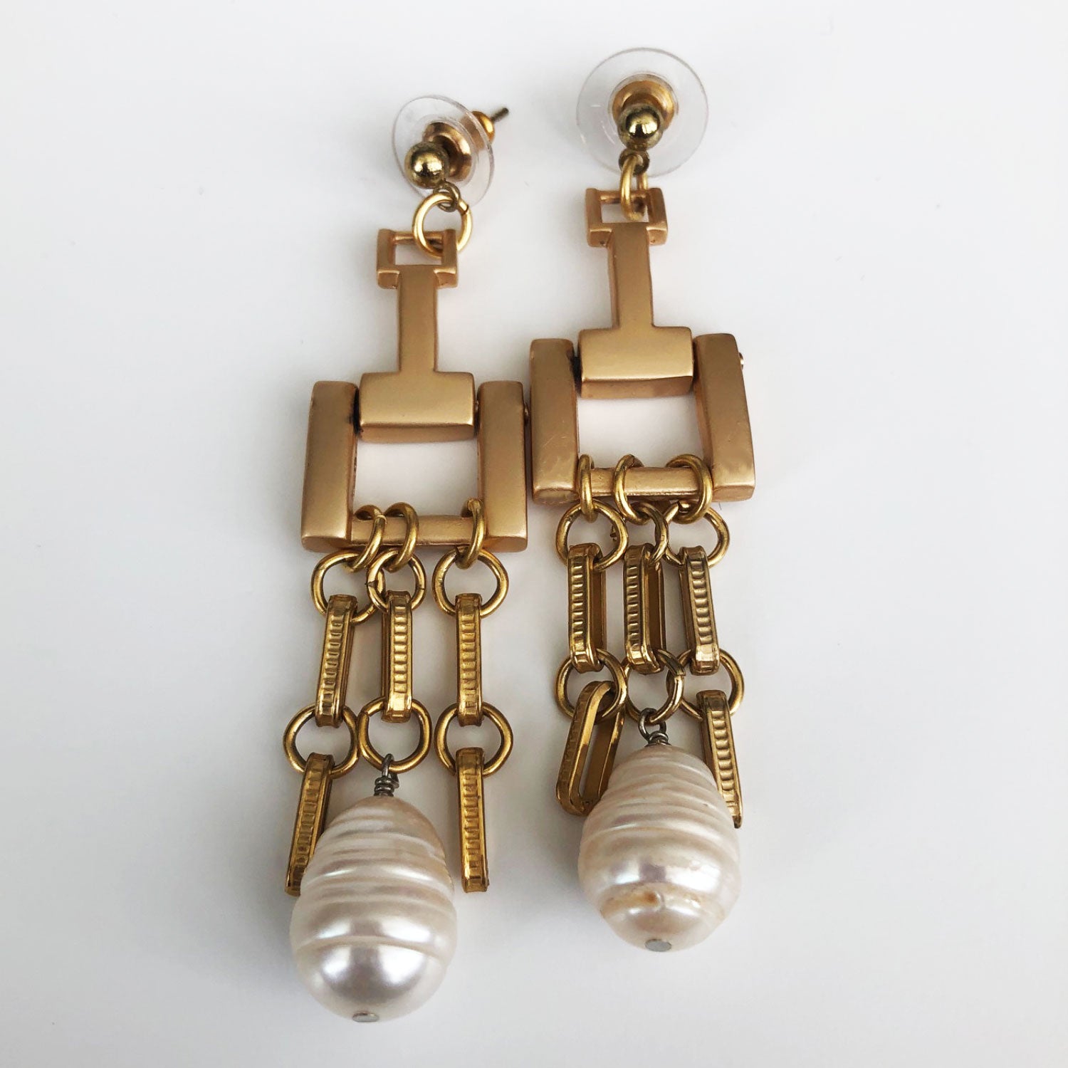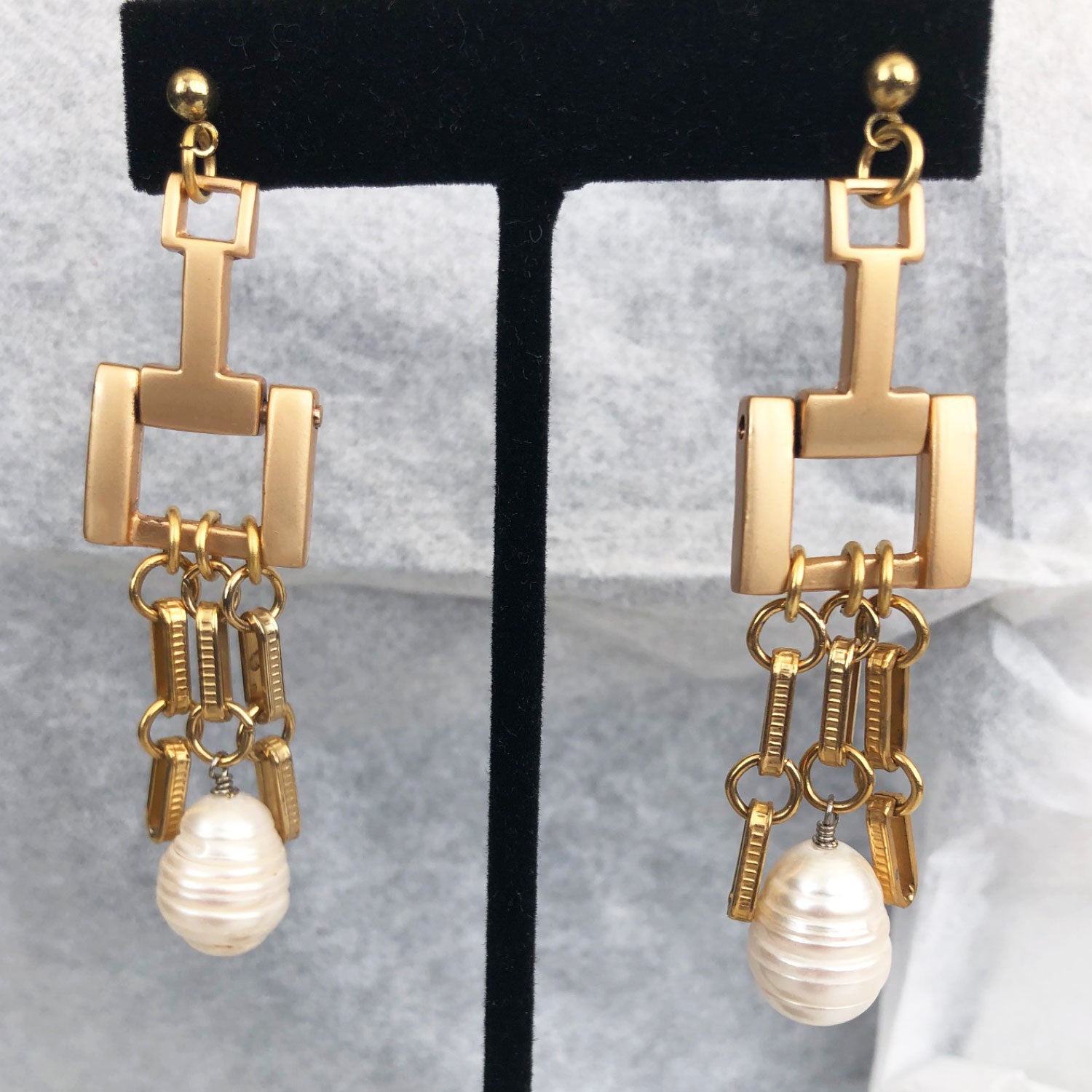 Matte stirrup stud earrings with vintage chain and freshwater pearl drop.