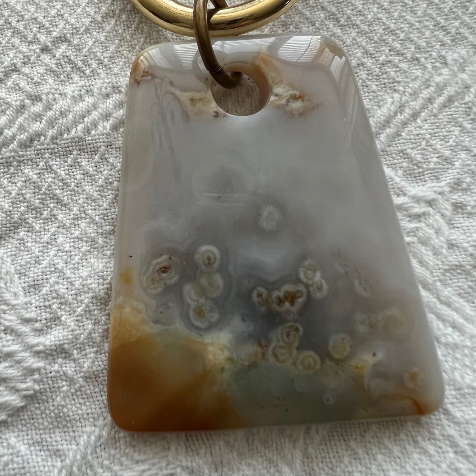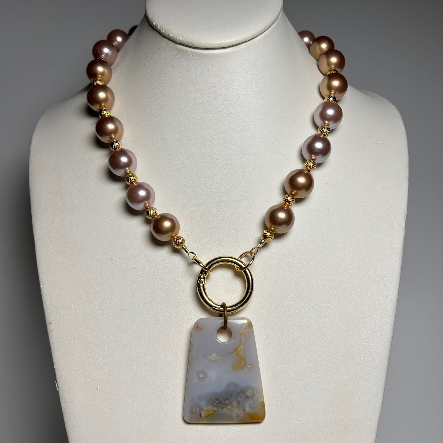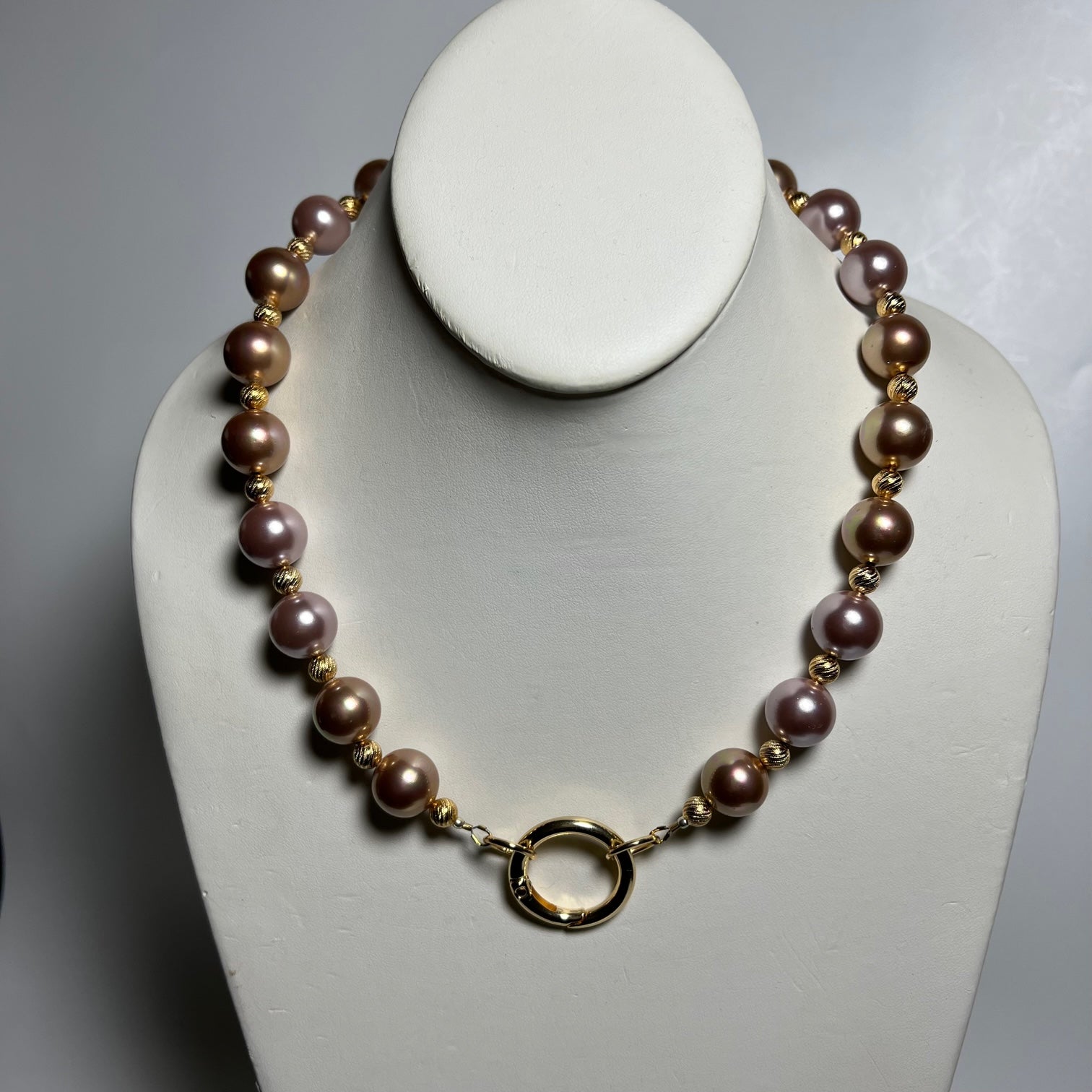 14MM pink and copper shell pearl necklace with gold filled embossed beads and an agate enhancer. The enhancer can easily be removed to wear the pearl necklace alone. The gold connector is easy to maneuver allowing you to add your own enhancers or charms. This is one of a kind. Approximately 18"