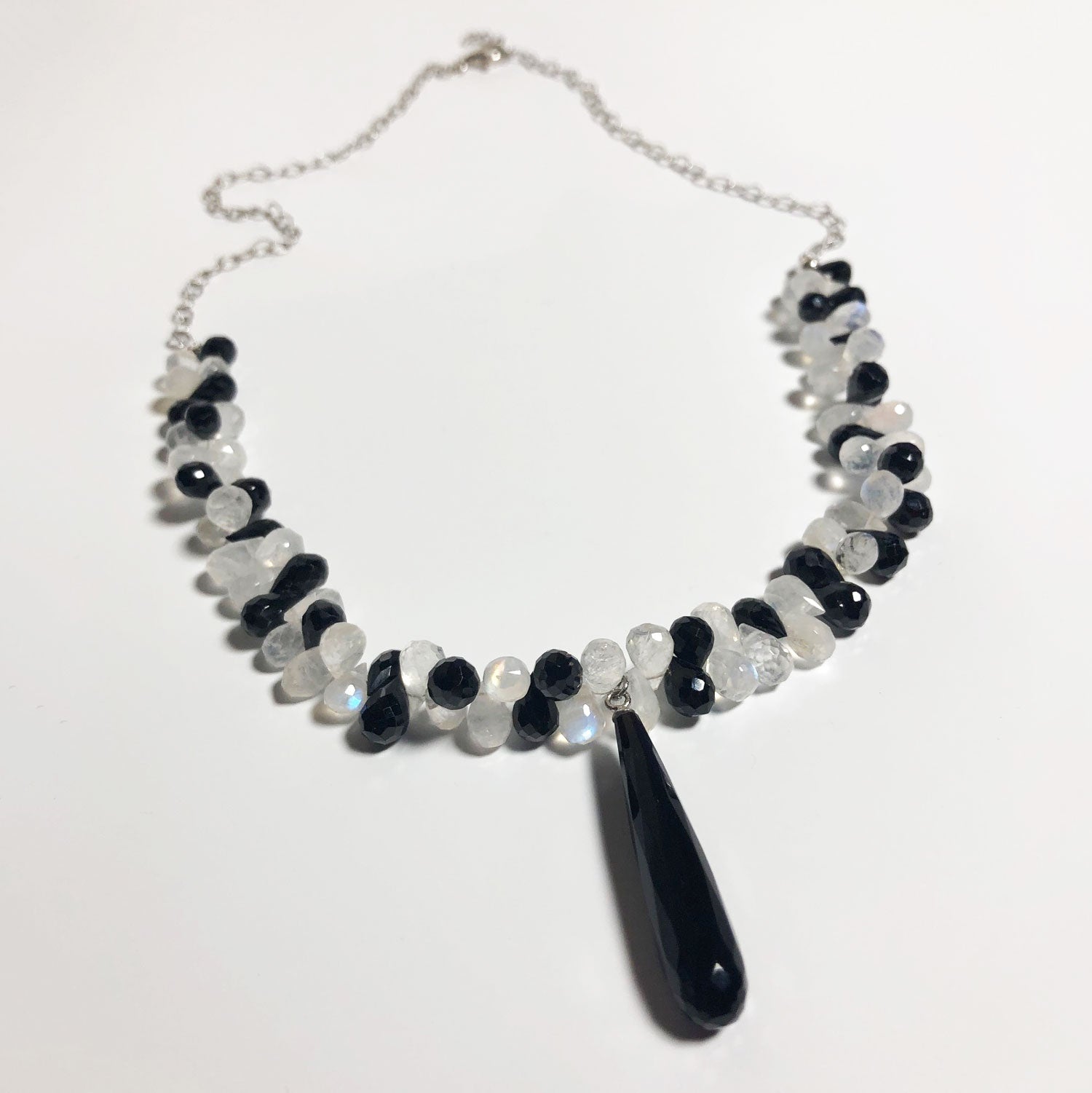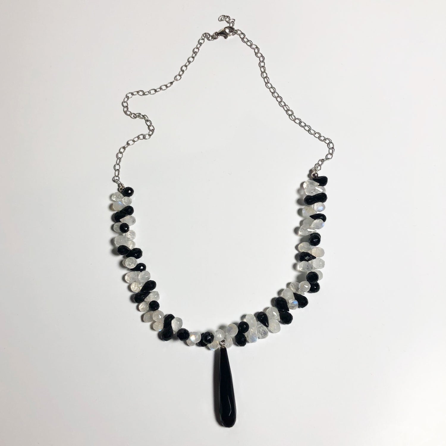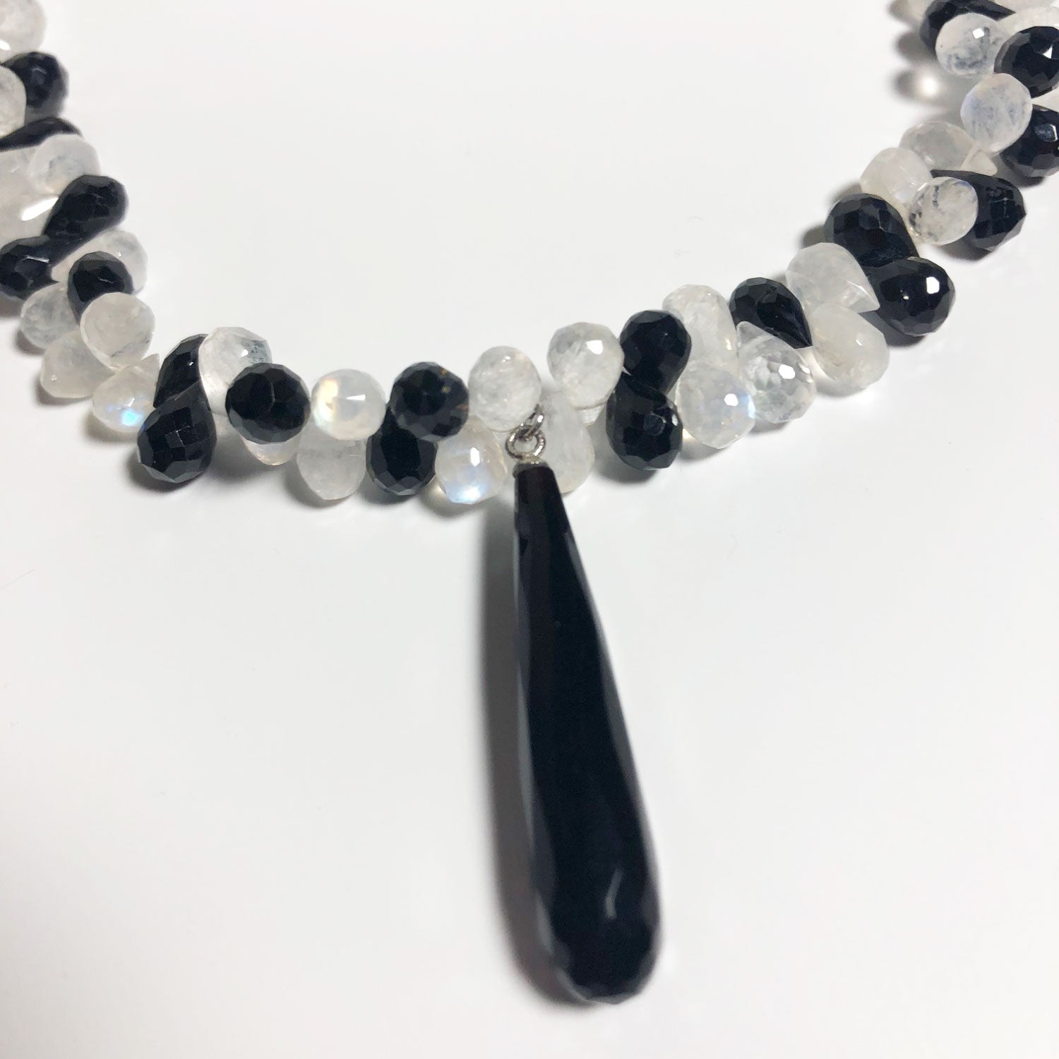 Moonstone and Black Spinel faceted teardrop beads strung on silk with Black Spinel large teardrop drop with Sterling Silver Chain and findings.