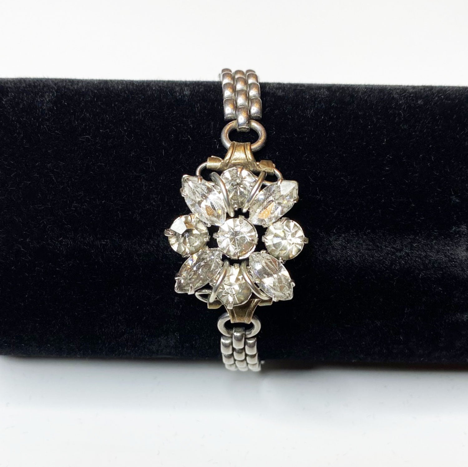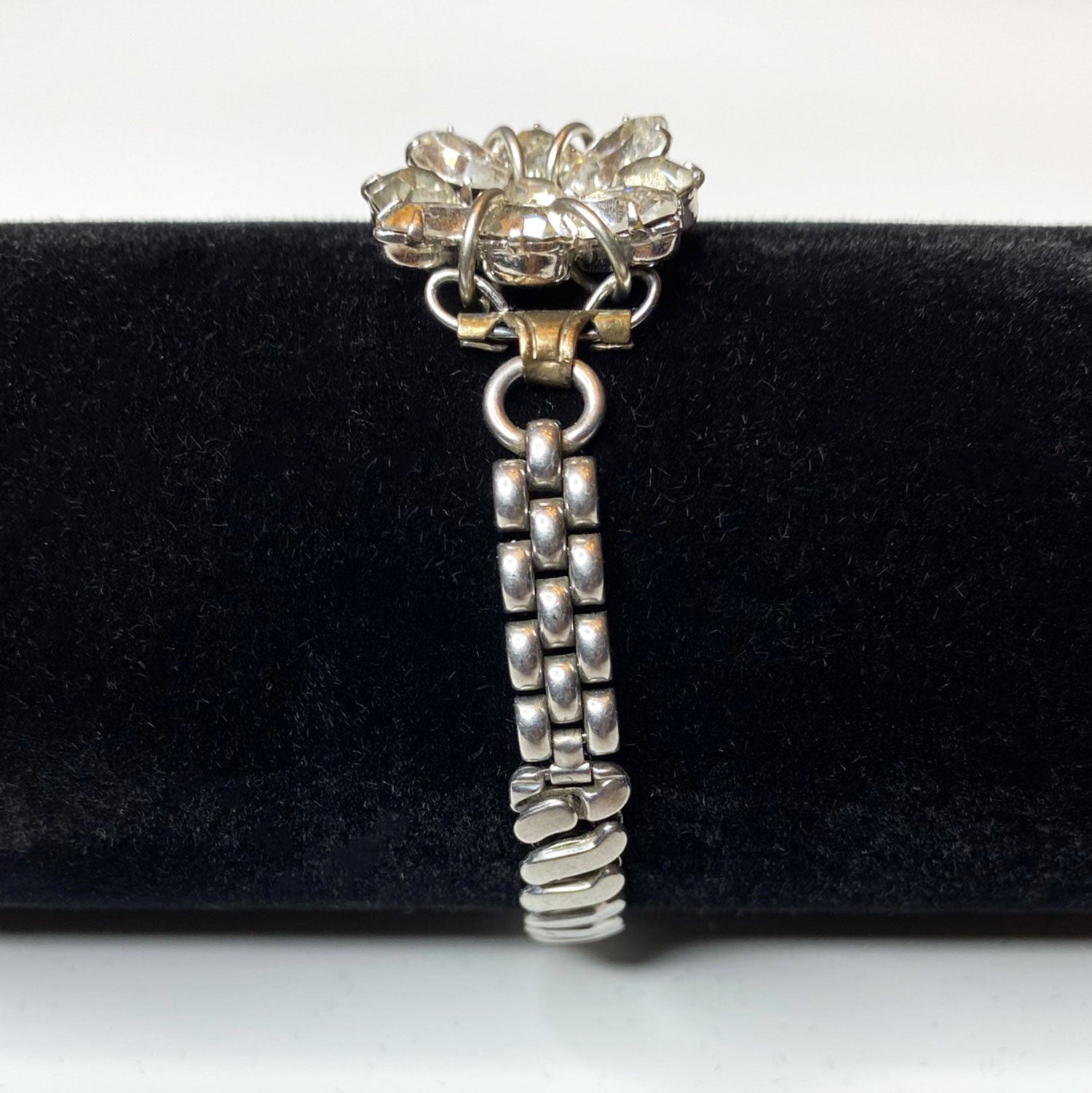 Vintage silver stretch bracelet featuring prong set rhinestone flower, circa the 1940s-50s.