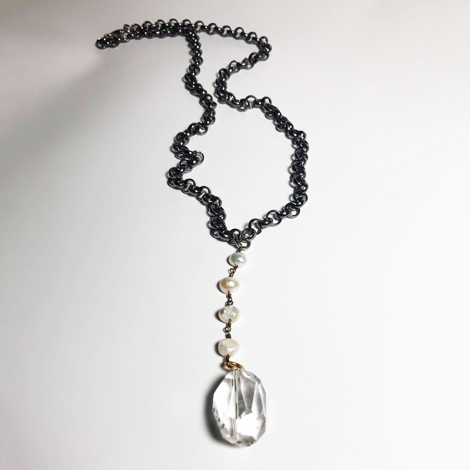 Satin silver chain with pearl rosary and crystal quartz faceted drop. Can be worn short.