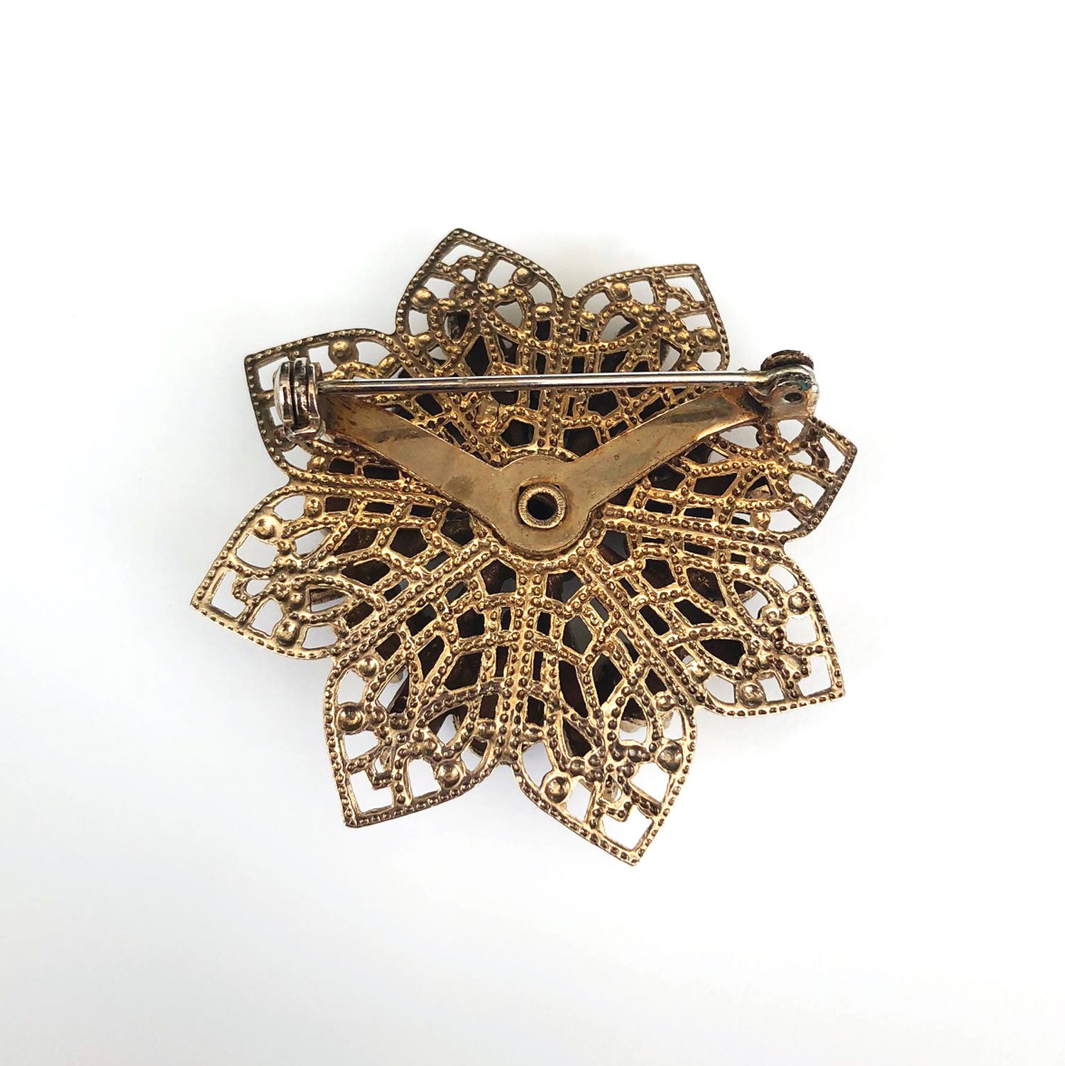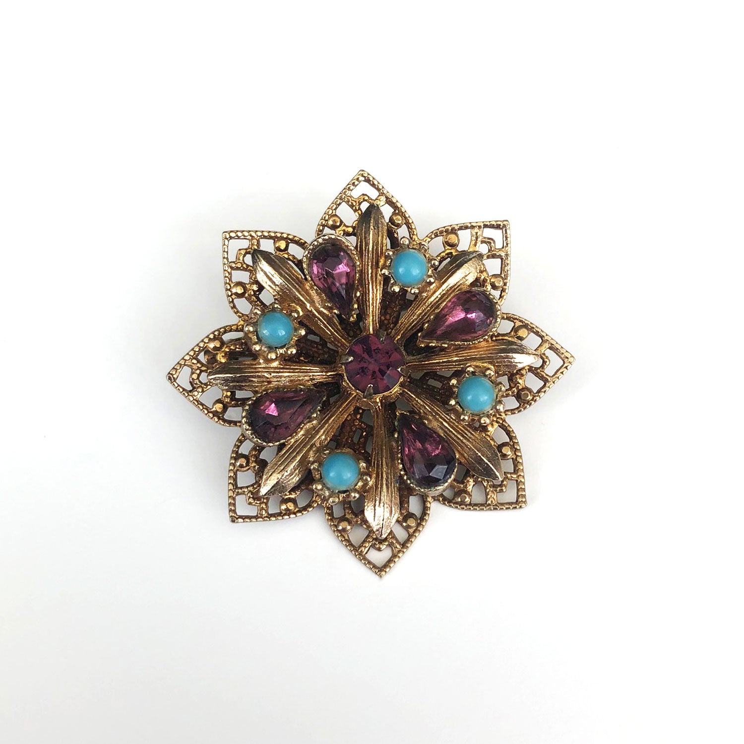 Midcentury 1950’s gold brooch featuring piercing, amethyst and turquoise stones.