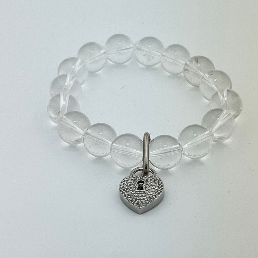 Quartz crystal stretch bracelet with micro pave CZ heart/lock charm