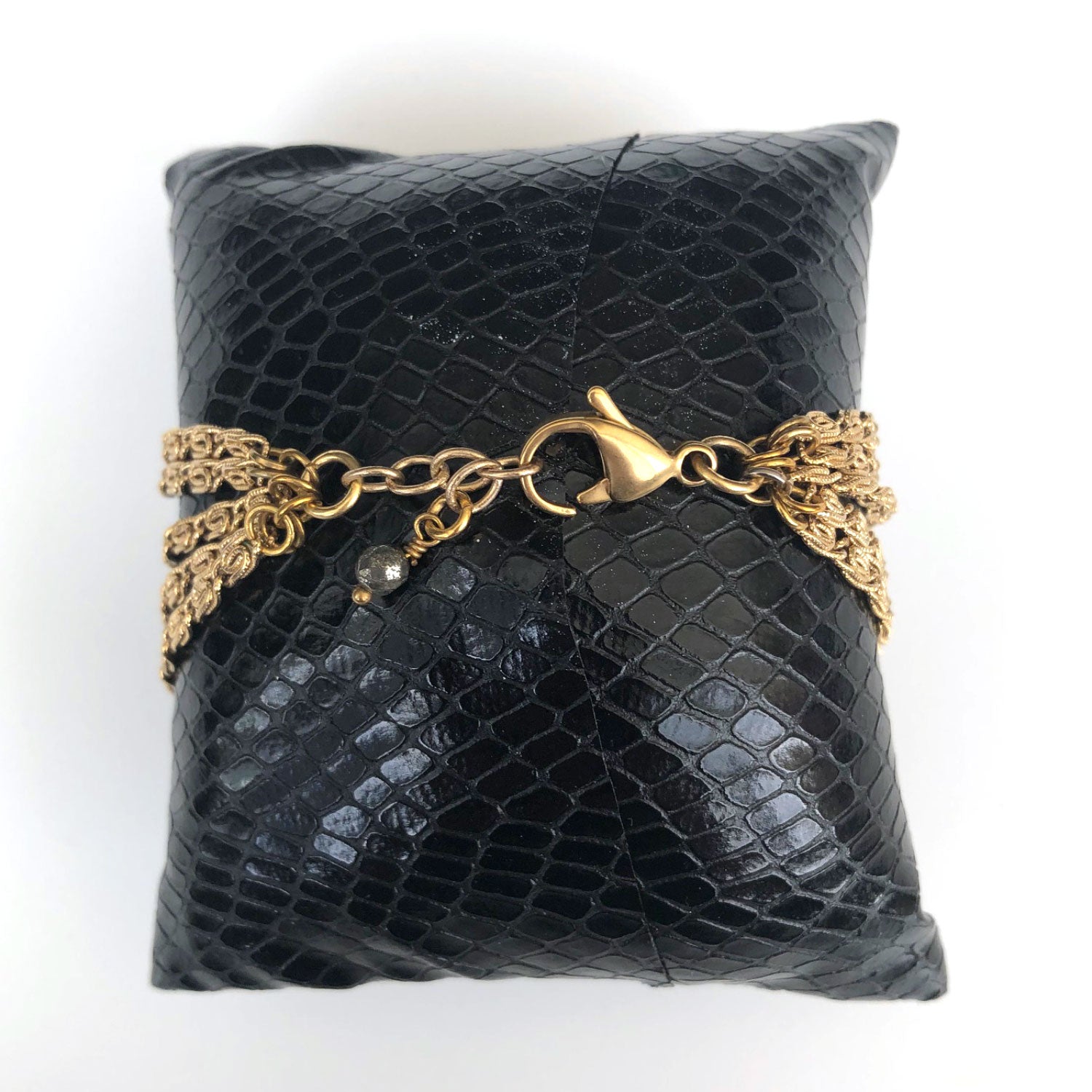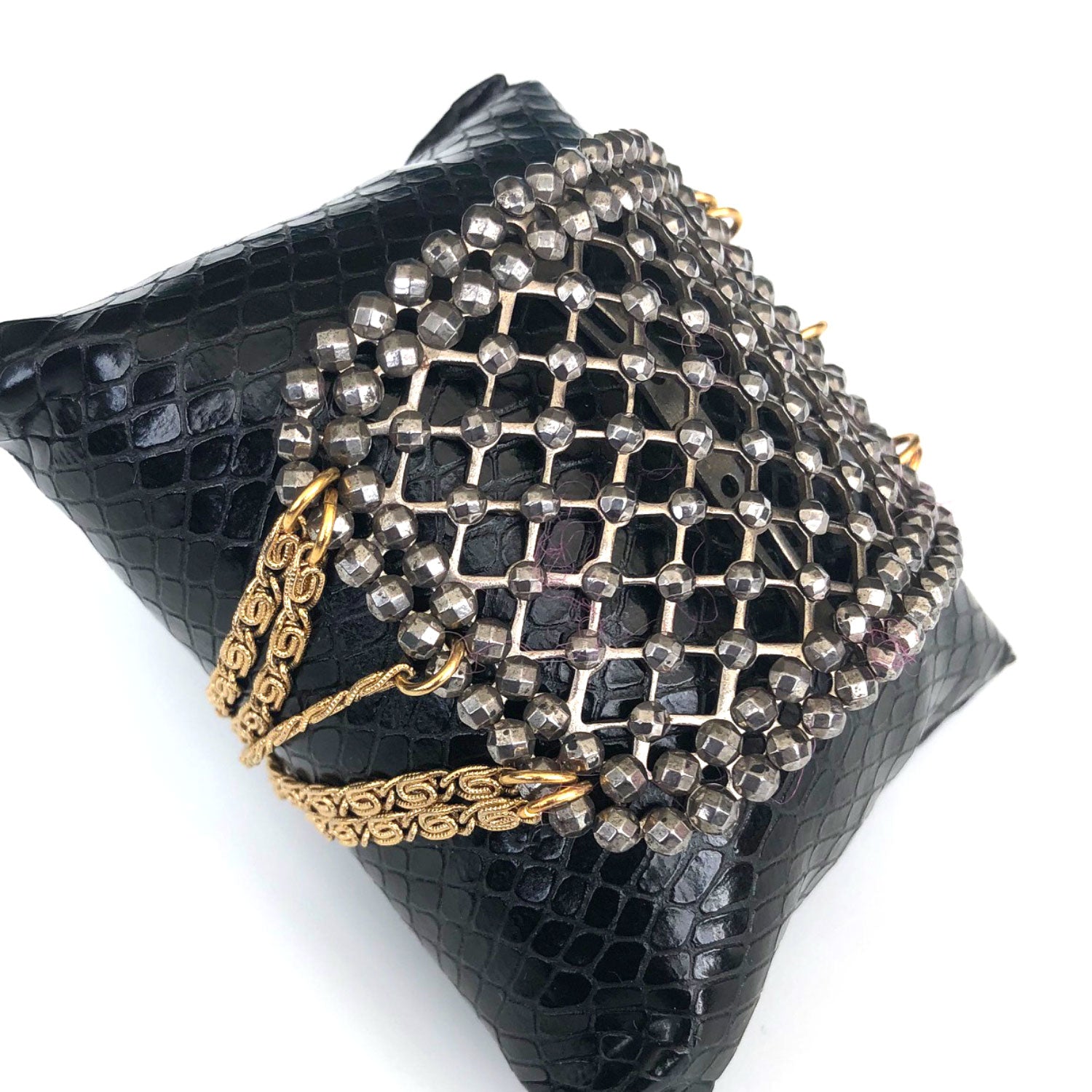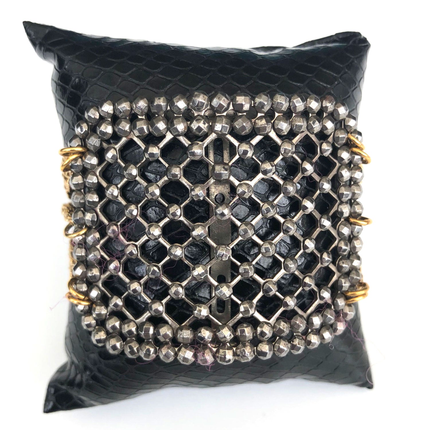 Bracelet made from antique silver, riveted cut steel, 1800s shoe buckle from France with decorative silver chain and lobster claw closure.