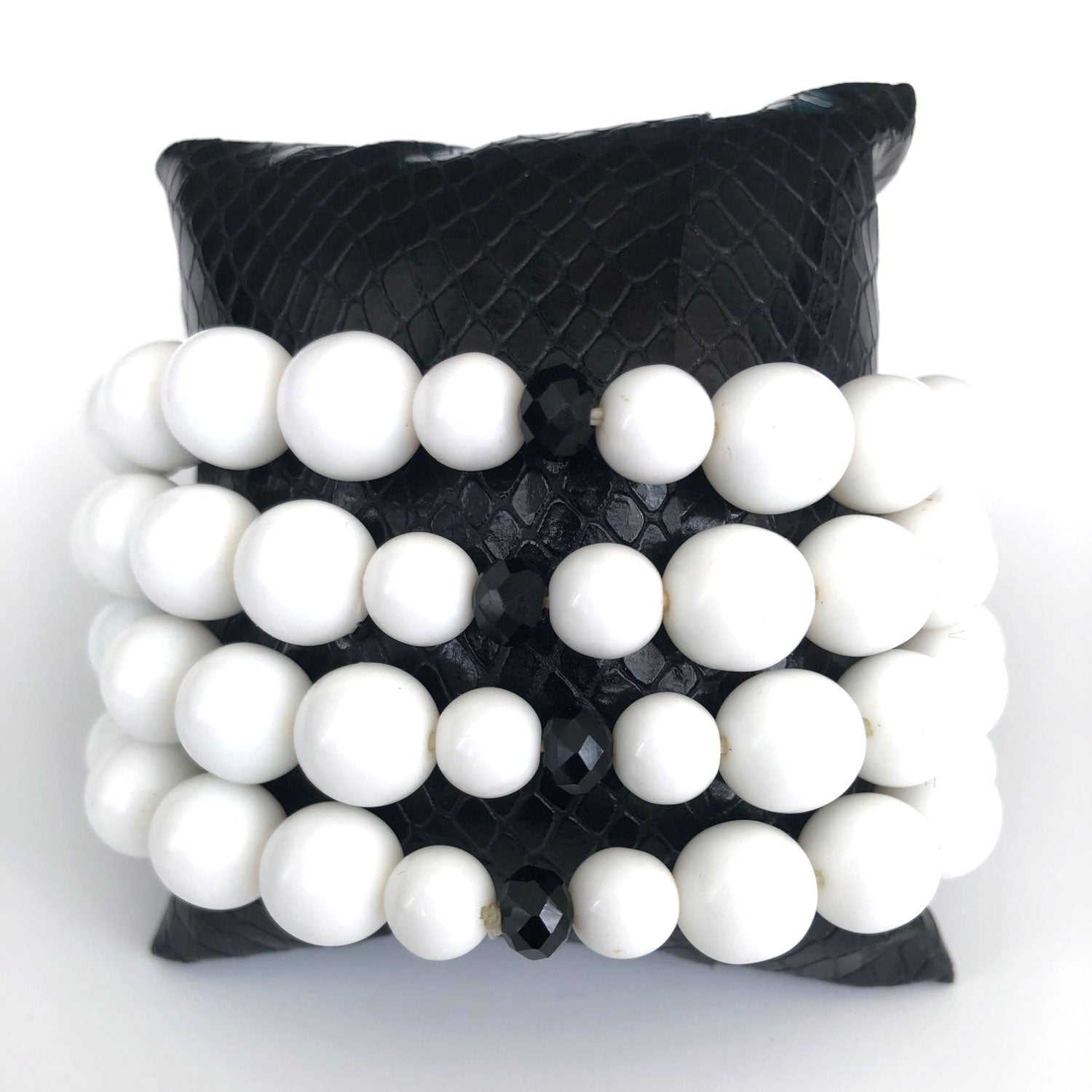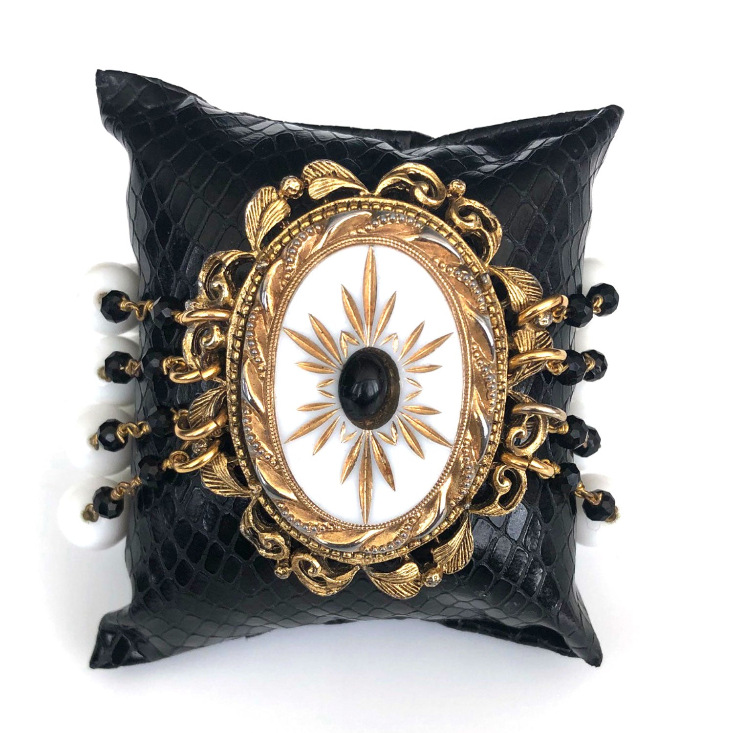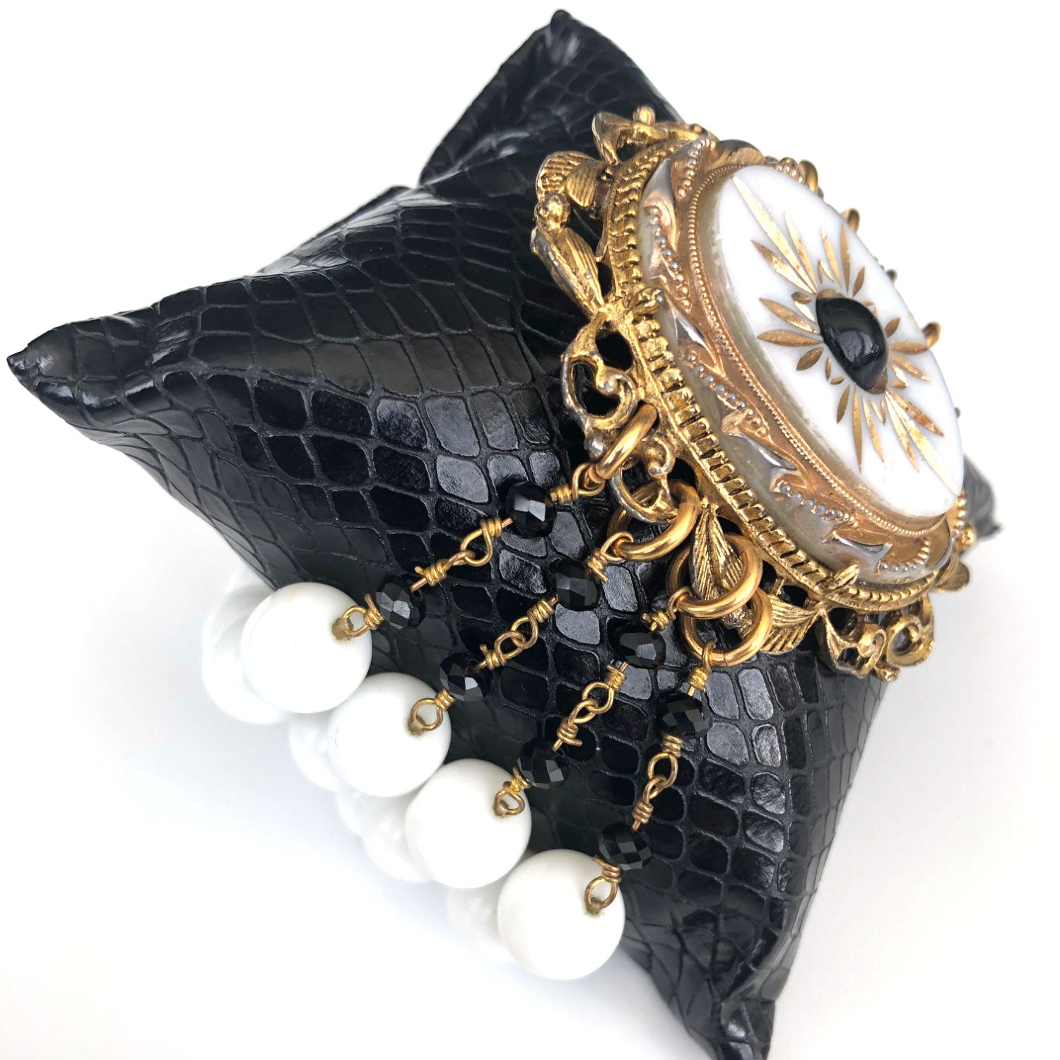 Four-strand stretch bracelet featuring a black oval vintage brooch, mid-century chalk beads, and faceted black crystal beads.