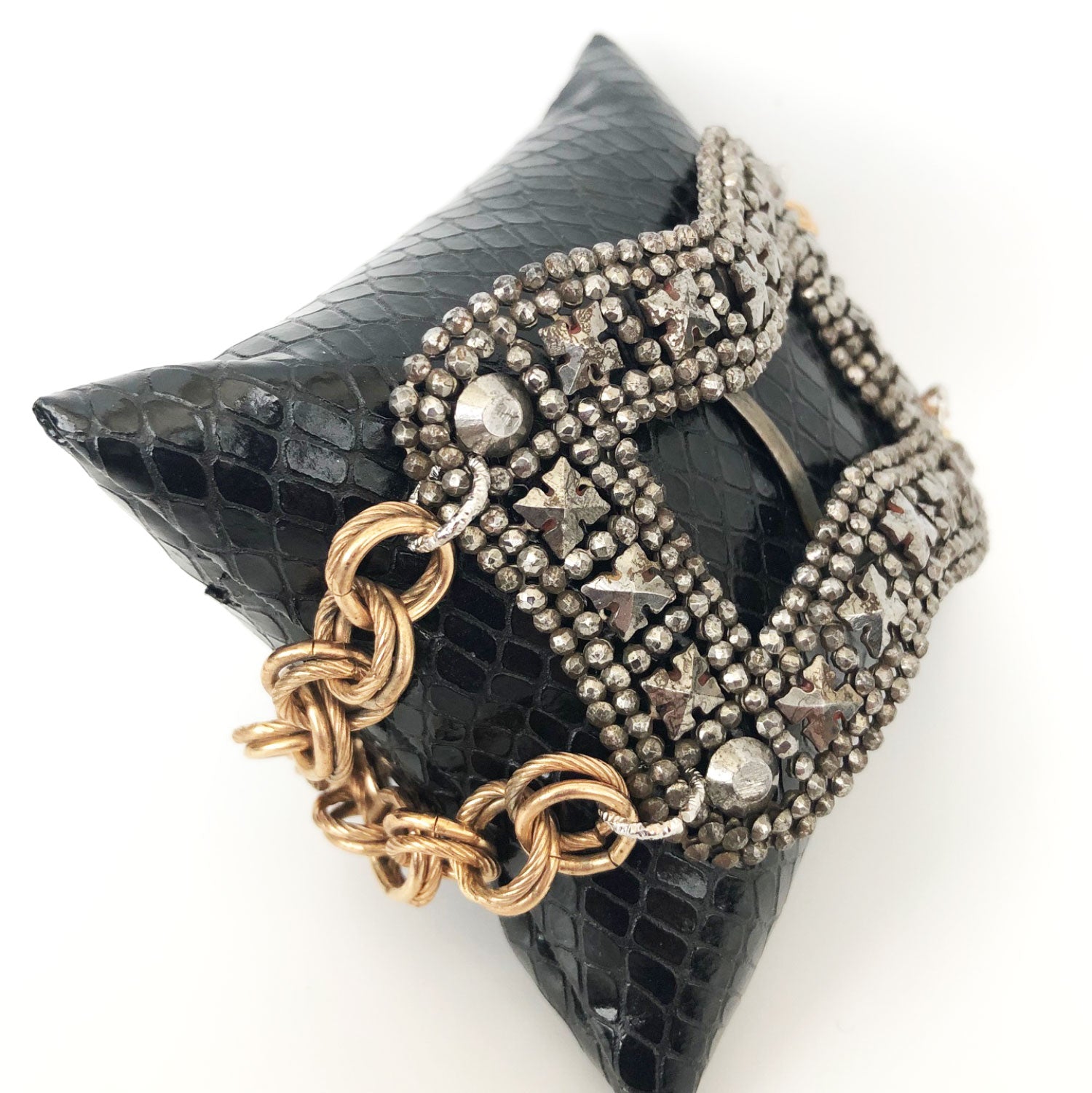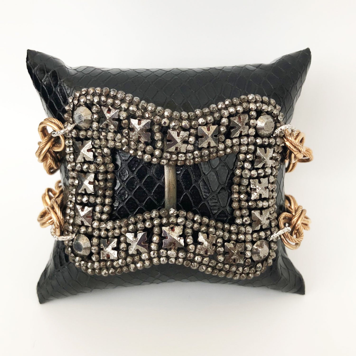 Bracelet made from antique silver riveted steel, 1800s French shoe buckle with intricate cut outs, with decorative vintage chain and magnetic closure and safety chain.