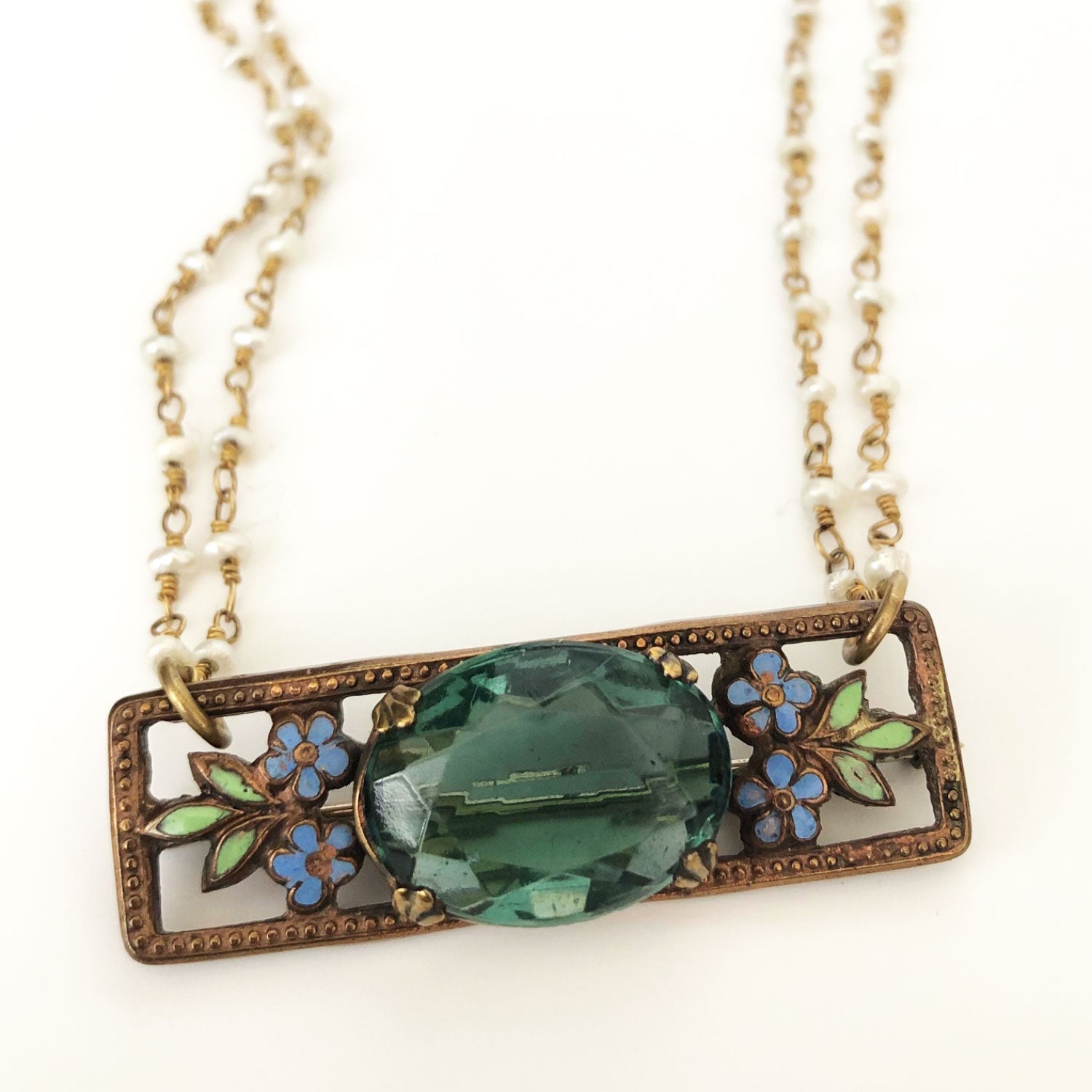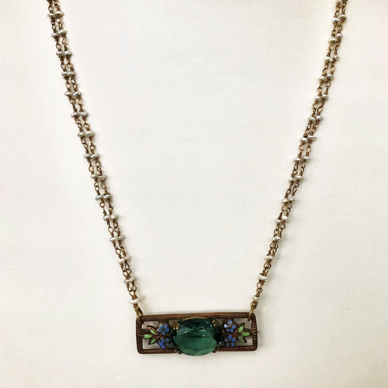 Victorian bar pin featuring enamel blue and green flowers with prong-set large green center stone on a double strand of dainty freshwater pearl rosary chain.